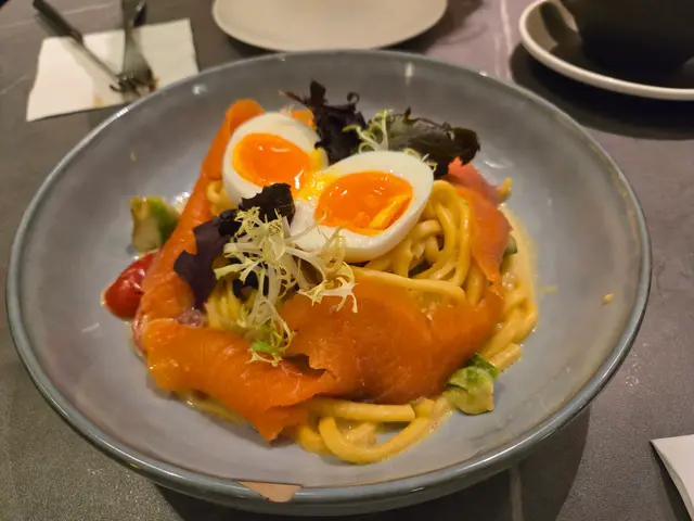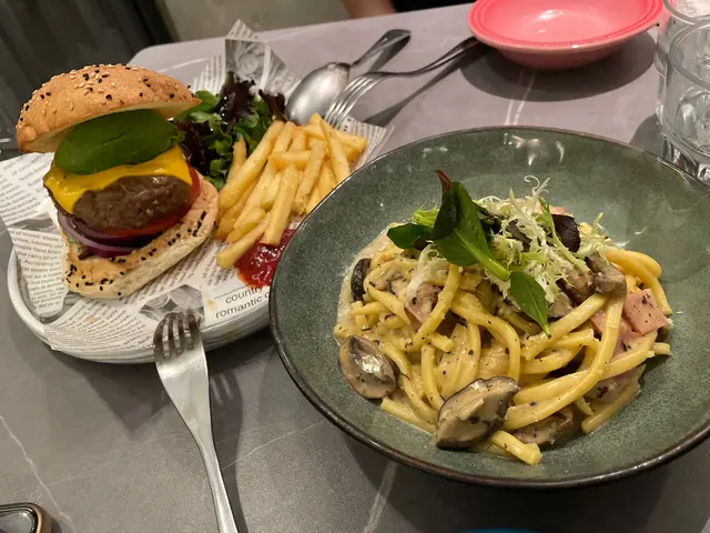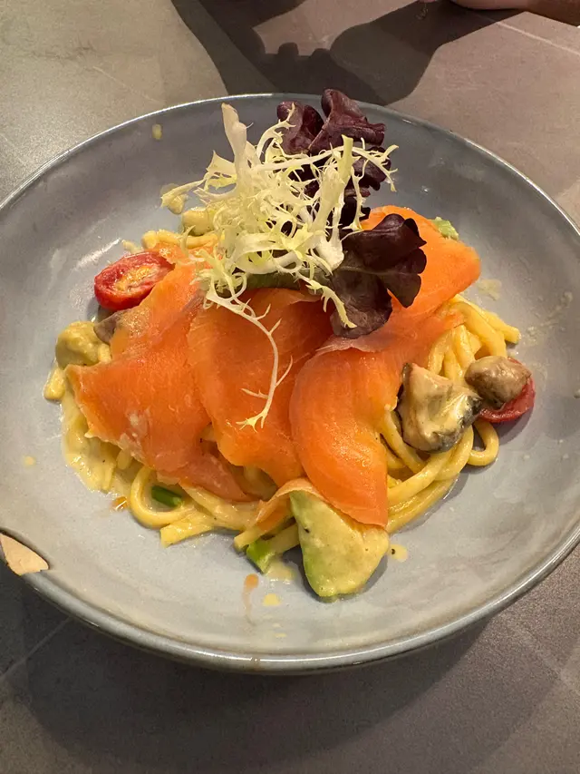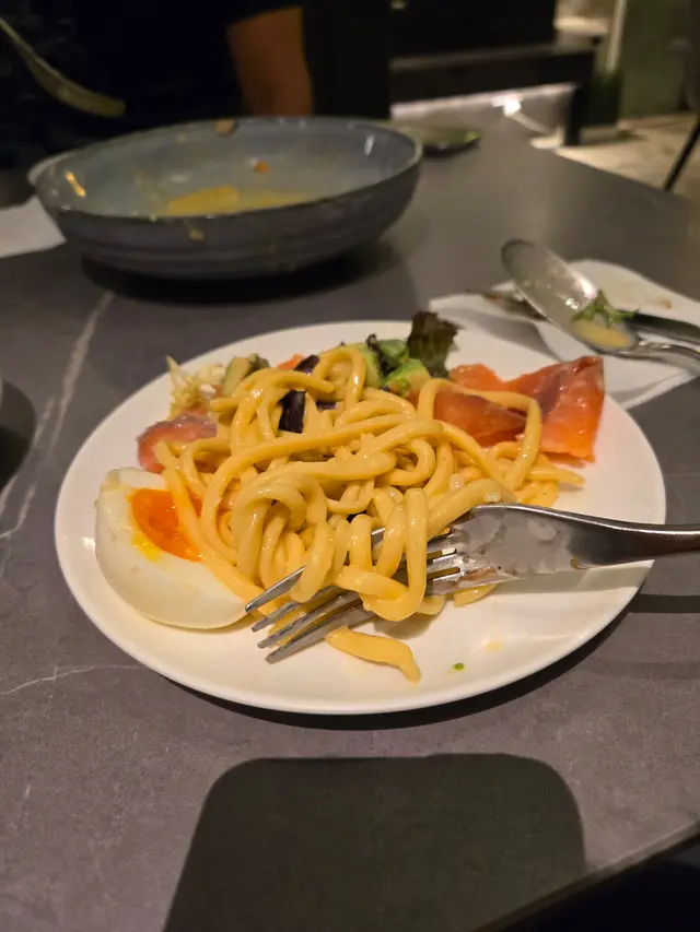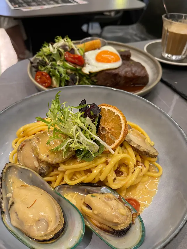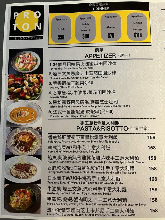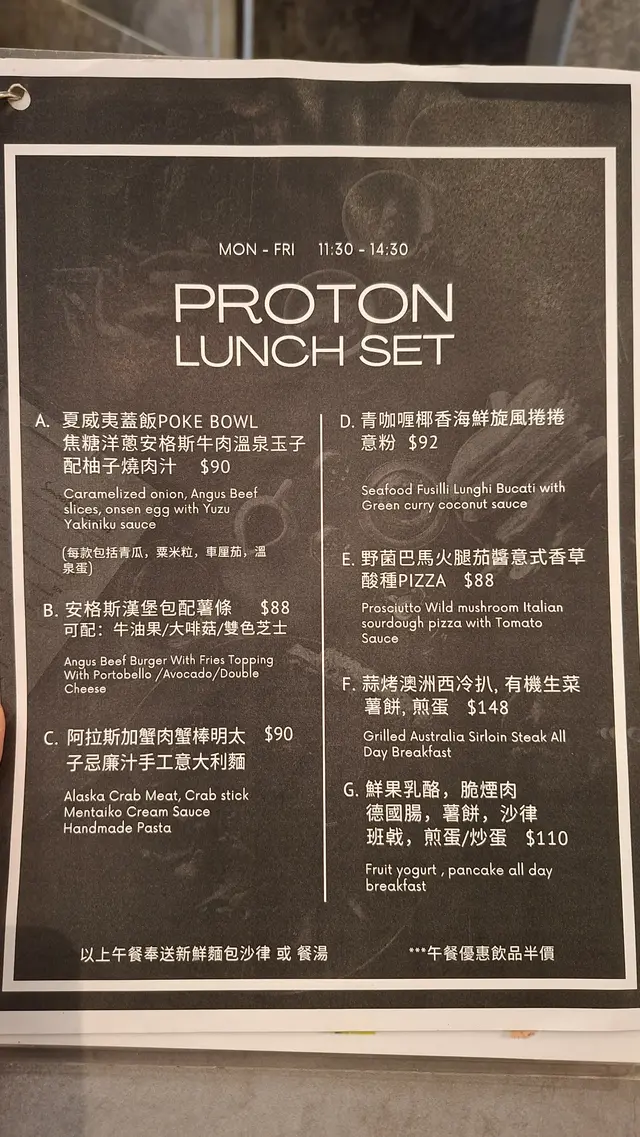 最近又去左元朗尋找好餐廳,依間以工業風設計嘅 "Proton",色調灰加黑,喜歡這裝修型格路線,以及鍾意食西餐嘅我哋,一於入去潮聖下先~入到餐廳,門口位置擺放張型嘅梳化同埋designer chair,打卡一流!牆上嘅燈光照落水泥牆到,更顯光芒,有創意!睇睇餐牌先,晚餐時段既Dinner Set,有多款手工意粉&意大利飯及主菜選擇,可另加$配埋前菜、飲品和甜品,款式都幾好。日本蘭王M7和牛海苔手工意大利麵 $168M7和牛肉質鬆軟嫩滑而不鞋口,香濃嘅自家製醬汁完全浸入牛肉內,非常入味,手工意大利麵食起嚟唔錯,質感彈牙,日本蘭王蛋及海苔令整份麵條鮮甜香濃。流心蛋紫菜煙肉芝士卡邦尼手工意大利麵 $158另一款係卡邦尼手工意大利麵,散發陣陣香濃忌廉味,配以焦香嘅煙肉,肉味鹹鹹香香,配合流心蛋、紫菜同芝士好夾,濃郁嘅醬汁與意大利麵煮得好入味,意粉口感煙靭有咬口,意粉好掛汁,越食越好味。24個月巴哈馬火腿蜜瓜田園沙律另加 $ 配兩款沙律 ~ 沙律非常新鮮,蜜瓜爽甜,巴哈馬火腿帶鹹香味,沙律菜爽脆,黑醋汁酸甜開胃,有誠意。蒜香蝦柚子雜果沙律另一款沙律都好開胃前菜,蒜香惹味嘅蝦,加上翠綠鮮爽嘅沙律菜、柚子、雜果,真不錯~蘋果菠蘿石榴羽衣甘藍汁多種蔬果混合,甜度適中,口感爽口,香甜可口,味道清新自然,仲有食得嘅羽衣甘藍同乾果。意大利朱古力依杯飲品真係特濃朱古力味,朱古力愛好者最啱呢,口感幼滑,面層嘅忌廉與朱古力脆脆,好味之餘,令人覺得甜蜜。…查看更多