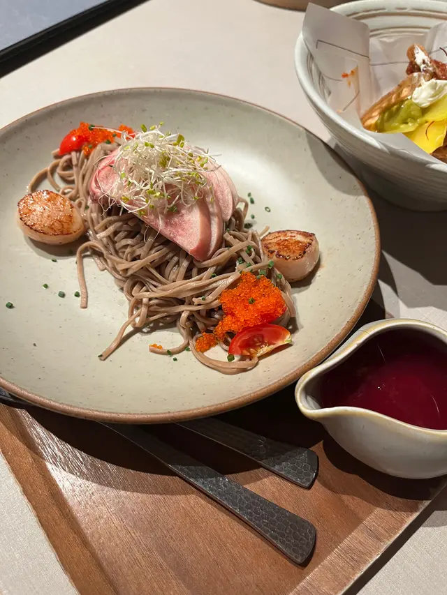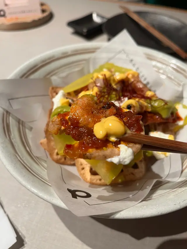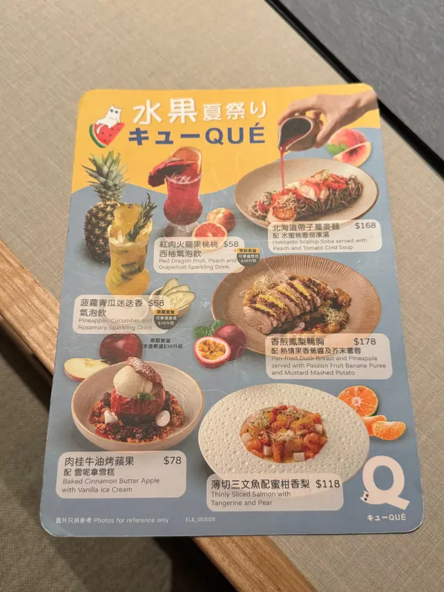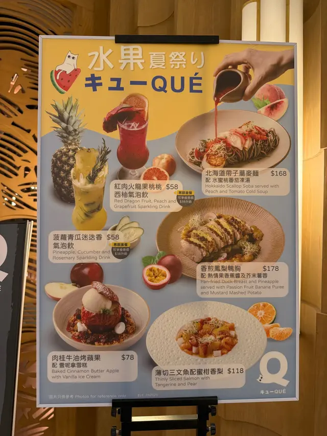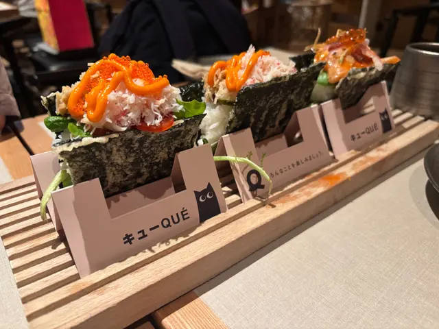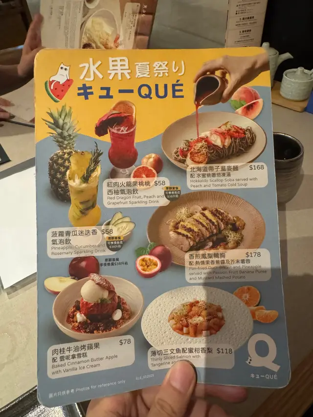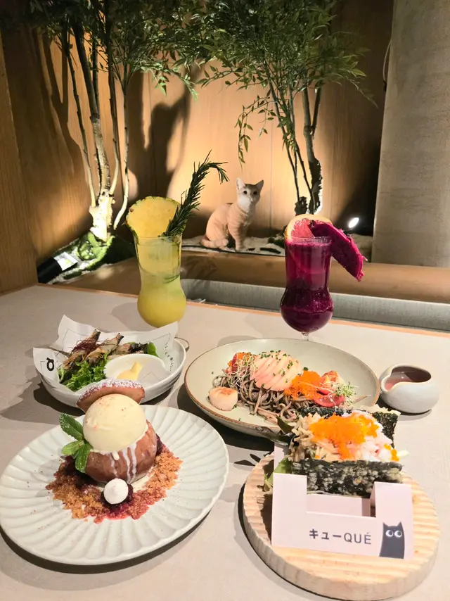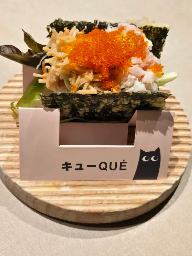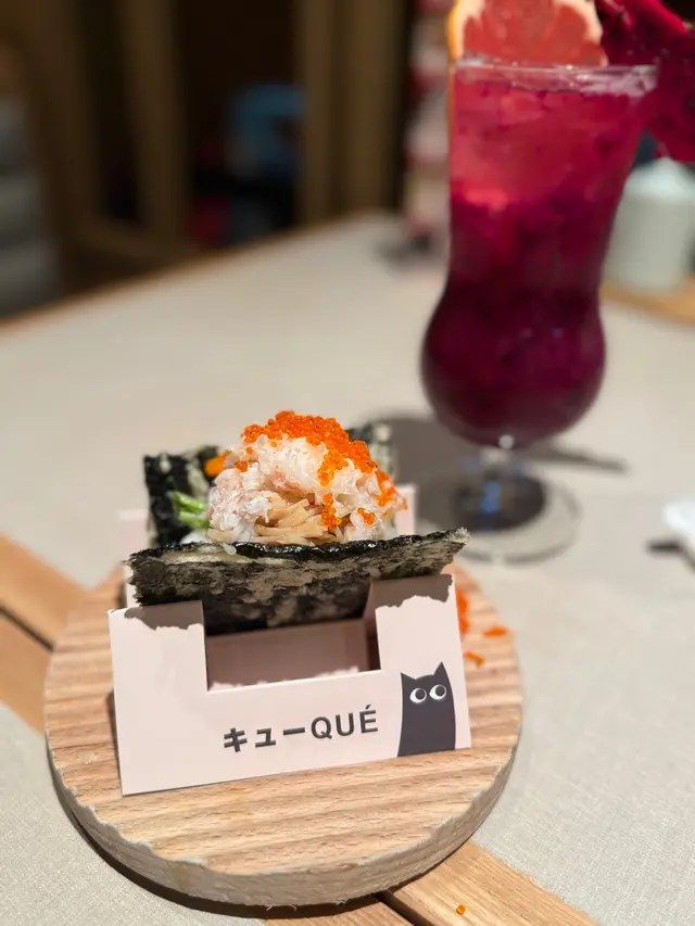 QUE是人氣西日餐廳,裝潢以淺木系為主,加上可愛貓貓元素,充滿少女心。空間感寬闊,坐在舒適卡位,品嚐和洋Fusion美食;豐富的壽司塔可、香脆的拿破崙,及吸睛的飲品,是週末好去處。松葉蟹肉海膽醬壽司塔脆卜卜的紫菜,包裹著鮮甜的松葉蟹肉,鮮香美味,加上海膽醬的點綴,令鮮味加倍升華。薄切三文魚配蜜柑香梨三文魚肉質鮮嫩,油潤可口,搭配香梨及蜜柑,鮮味中柑果的清香,清新怡人。香煎鳳梨鴨胸配熱情果香蕉及芥末薯蓉香煎的鴨胸外焦內嫩,肉汁juicy,搭配熱情果香蕉醬的酸甜,滋味吸引。芥末薯蓉綿蜜,微微的辛香,豐富的口感。紅肉火龍果桃桃西柚氣泡飲粉緻的氣泡飲,以鮮艷的火龍果,和桃子的甜香為基底,瀰漫蜜甜果香,加上西柚雜果,入口清新又fruity,很適合女孩子。菠蘿青瓜迷迭香氣泡飲充滿熱帶氣息,菠蘿與青瓜清爽結合,氣泡感十足,清涼解渴,適合炎熱的夏天。草莓蜜柑拿破崙拿破崙酥皮外層,夾著奶滑吉士醬,沁出濃厚牛油香,搭配草莓和蜜柑的清新,甜而不膩,是誘人的飯後甜點。…查看更多