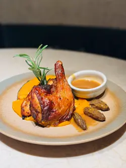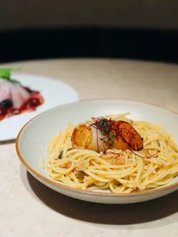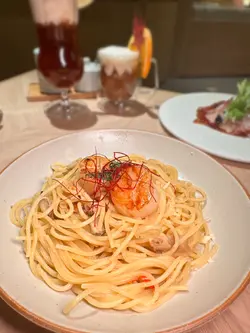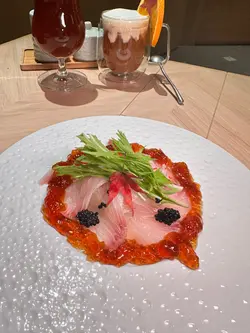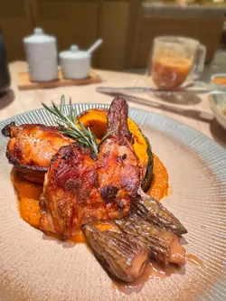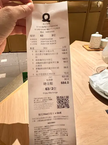 最近约咗朋友来到呢间QUE试新菜款,这间QUE在希慎商场地库,位置非常易找。餐厅走日式木系风格,观感好舒服,给人有一种写意的感觉,餐厅主打和洋式美食。知道最近餐厅推出咗一系列秋冬季菜款,所以今日到来试试新菜。🍴 间八薄切佐京都水菜摆盘非常精美,中间铺满咗新鲜肥美嘅间八鱼薄切,再配上京都水菜和鱼子酱,再用土佐啫喱围住,呢个头盘已经好掂。🍴香煎带子荣螺目柱蒜片意粉带子和荣螺目微微煎香,里面仍非常鲜嫩多汁,蒜片微微焦香再溶入在意粉里,非常香口兼惹味。🍴 烧春鸡伴日本南瓜呢只烧鸡烧到皮脆肉嫩,日本南瓜烤到非软糯而且极为香甜,再配埋特制嘅羊肚菌汁,每啖都食到浓厚嘅菌香味,真系好掂。🍴柚子雪葩无花果芭菲无花果非常香甜,柚子雪葩酸甜恰到好处,劲清爽,整体口感层次够晒丰富。🍴 鸿枫糖乳酪奶盖苹果生姜伯爵茶淡淡清香嘅伯爵茶配埋绵密奶盖,再加上枫糖嘅香甜和生姜嘅暖和,充满冬日气息。🍴枫糖乳酪奶盖香橙伯爵茶同样系用伯爵茶做茶底,配上香甜枫糖和橙香,够晒暖和。…查看更多