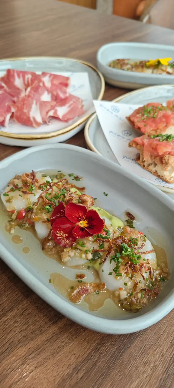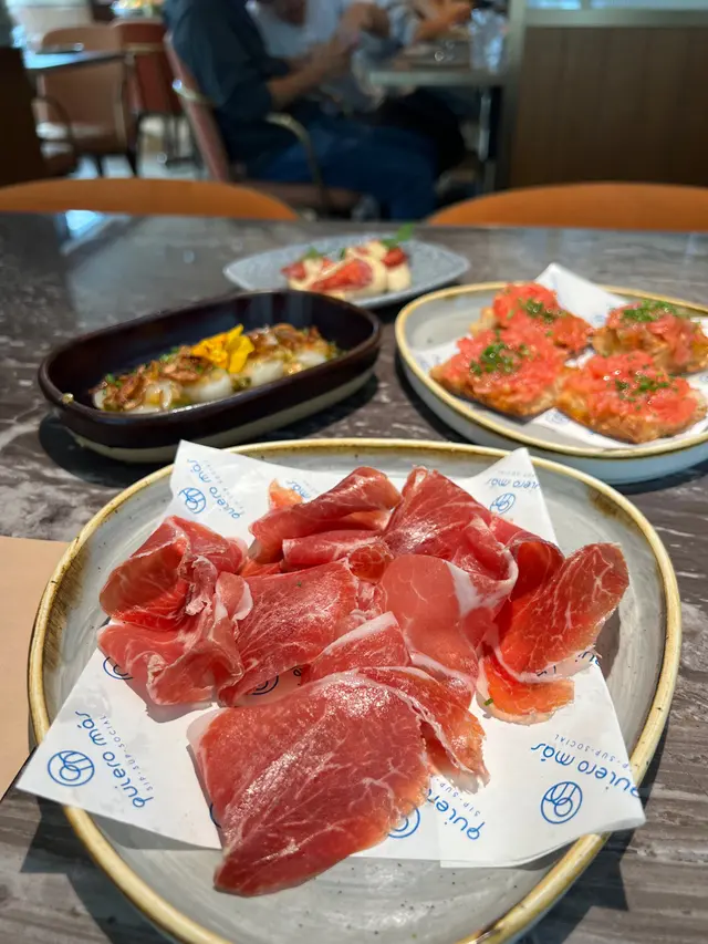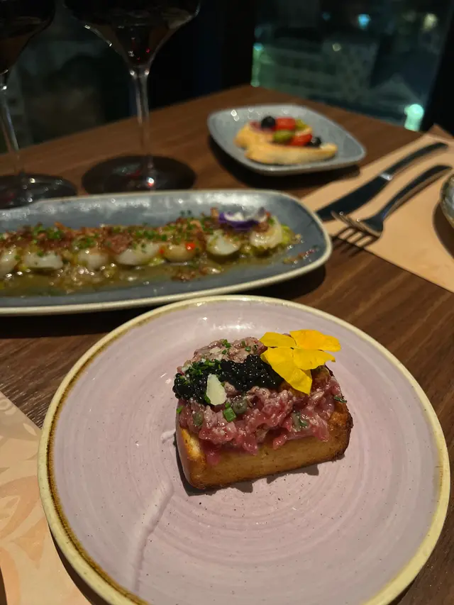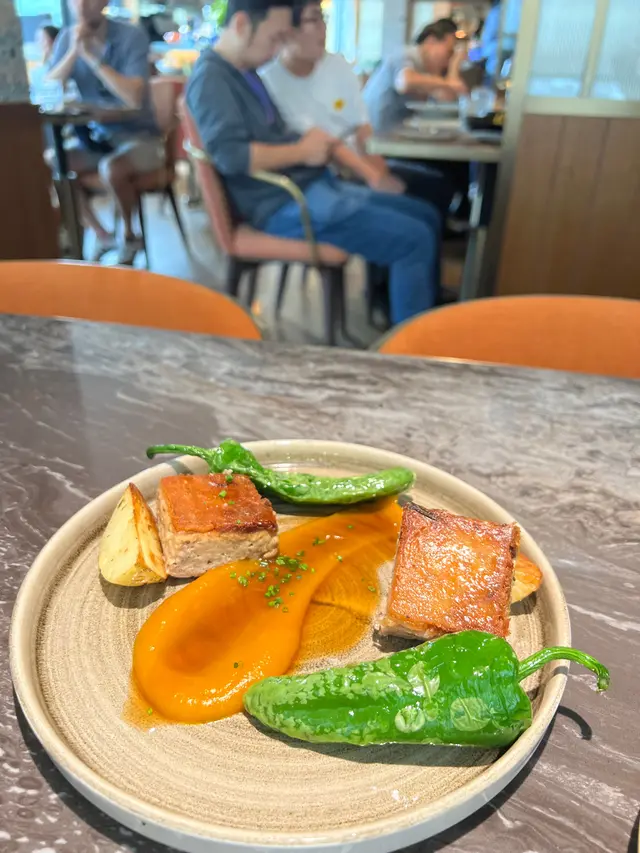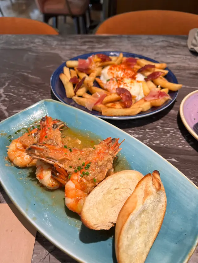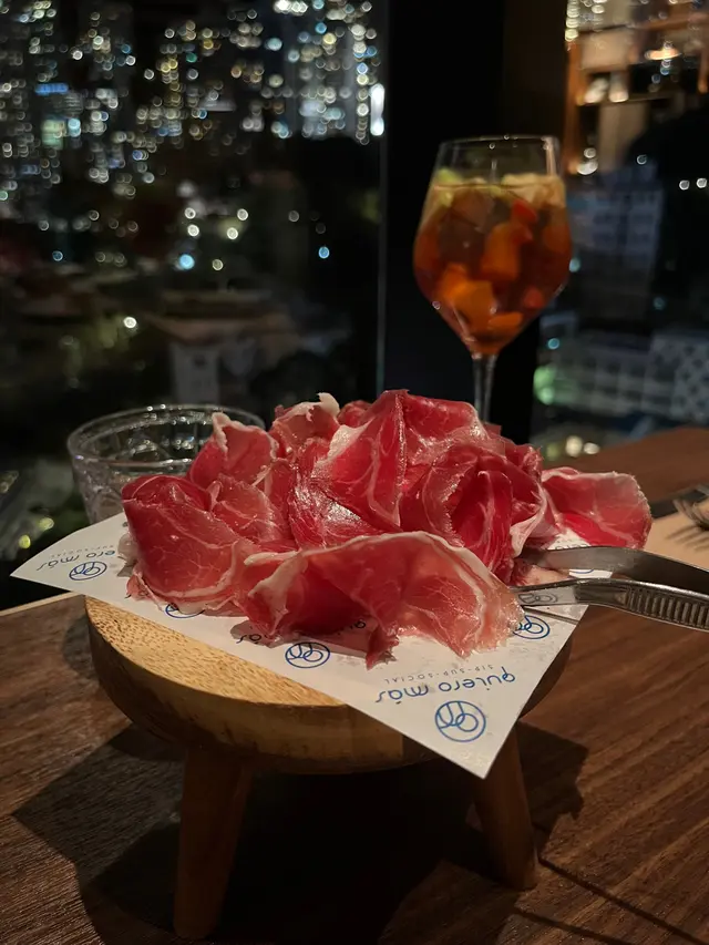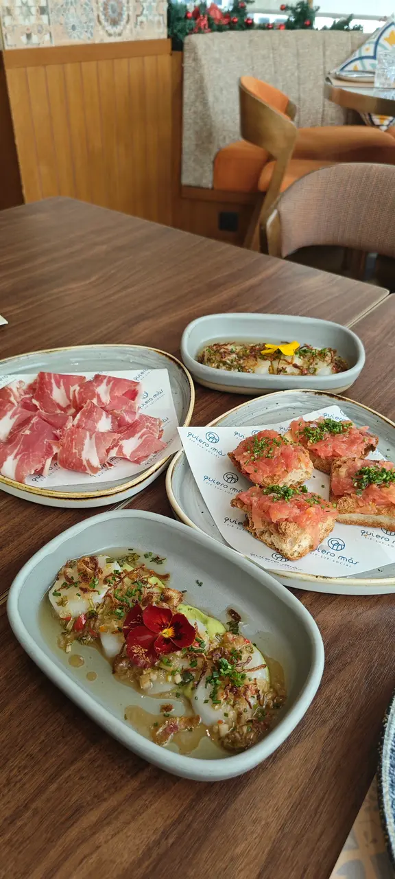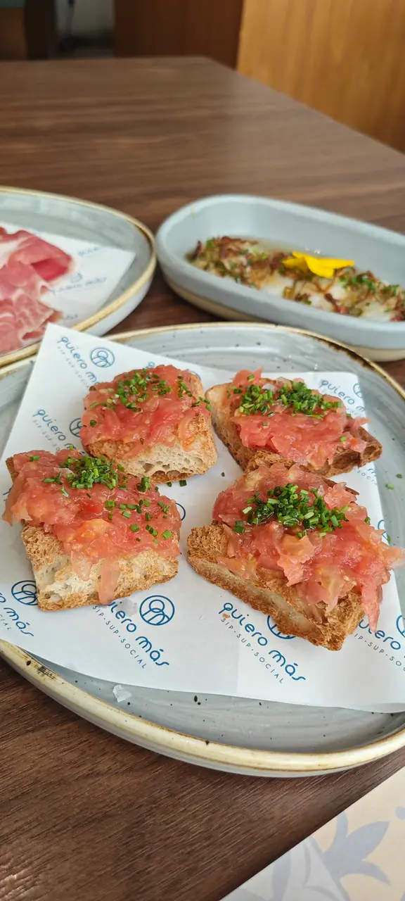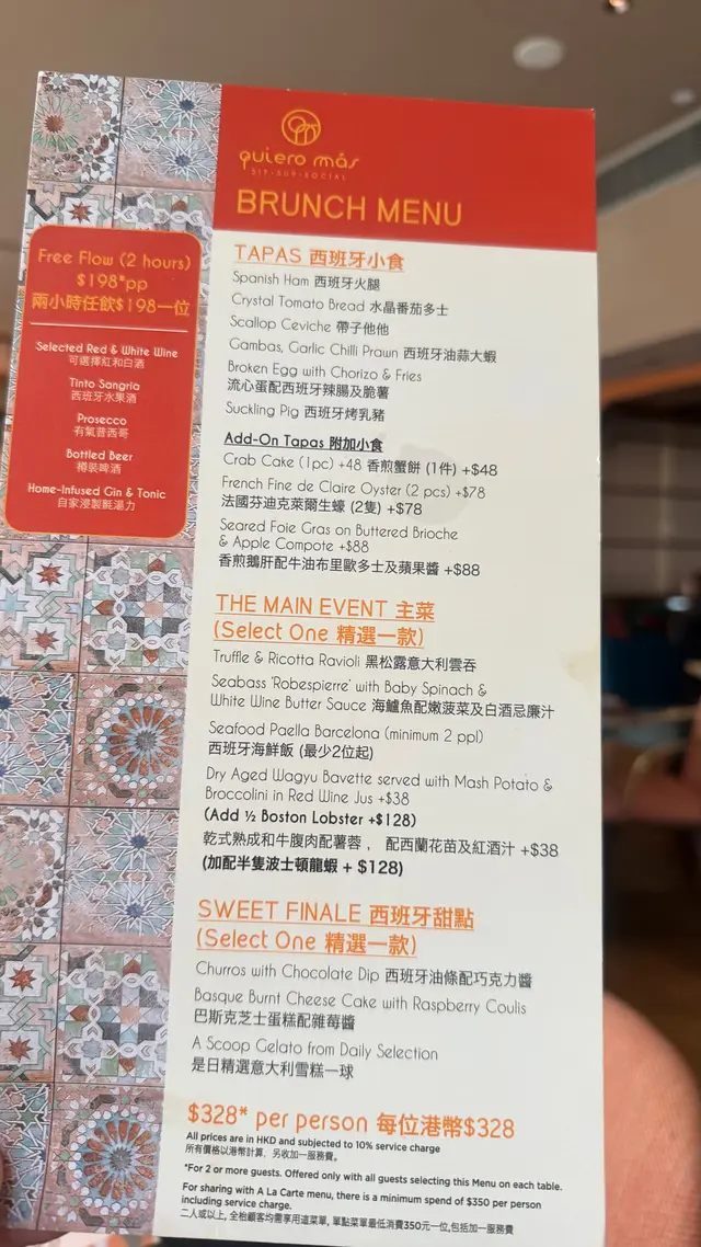 位於中環威靈頓廣場M88❣︎Quiero Más❣︎係一間主打食西班牙🇪🇸菜嘅餐廳,呢到weekend嘅brunch menu $328一位由前菜食到甜點,超級豐富🤤加$198仲可以無限任飲紅白酒🍶啤酒🍻水果酒🍹等等⋯⋯餐廳仲有埋樂手為大家即場表演風琴🎵氣氛超好👍🏻天台仲設有一個露天小型酒吧區,喺到嘆下啤酒🍻同朋友傾吓偈勁chill,今日去嘆lunch,全場滿座,認真厲害👏🏻✿西班牙🇪🇸小食✿(前菜)❣︎西班牙火腿❣︎呢個做前菜好有驚喜🤩肉質油潤,味道濃郁甘香👍🏻❣︎水晶蕃茄多士❣︎多士烤得酥脆,再配搭埋蕃茄蓉,口感清新。❣︎帶子他他❣︎帶子鮮甜細嫩😋👍🏻配上牛油果🥑蓉同青檸🍋🟩做醬汁,層次豐富。❣︎西班牙油蒜大蝦❣︎大蝦超新鮮彈牙😋👍🏻蒜香味濃郁,配搭嘅麵包可以沾埋蒜茸汁來食,好滋味。❣︎流心蛋配西班牙辣腸及脆薯❣︎流心蛋充滿蛋香😋薯條即炸好香口👍🏻加埋西班牙🇪🇸辣腸,超邪惡😈❣︎西班牙烤乳豬❣︎烤乳豬外皮烤至金黃焦脆😋乳豬軟嫩多汁,甘香唔油膩。❣︎法國芬迪克萊爾生蠔(2隻)❣︎➕$78生蠔🦪肉質鮮甜,彈性爽口。✿西班牙🇪🇸主菜✿❣︎海鱸魚配嫩菠菜及白酒忌廉汁❣︎海鱸魚煎得金黃酥脆,魚皮微脆,肉質鮮嫩帶甘甜。❣︎乾式熟成和牛腹肉配薯蓉,配西蘭花苗及紅酒汁❣︎➕$38⭐️必食推薦😋👍🏻和牛腹肉有極度濃郁嘅和牛風味🤤鮮嫩多汁,口感勁軟嫩,食唔停口。✿西班牙🇪🇸甜品✿❣︎西班牙油條配巧克力❣︎油條炸得外酥內軟,配埋香甜嘅朱古力醬,甜而不膩。❣︎開心果意大利雪糕❣︎濃郁嘅果仁香氣😋👍🏻雪糕口感綿密,質地滑順。…查看更多