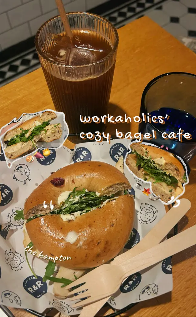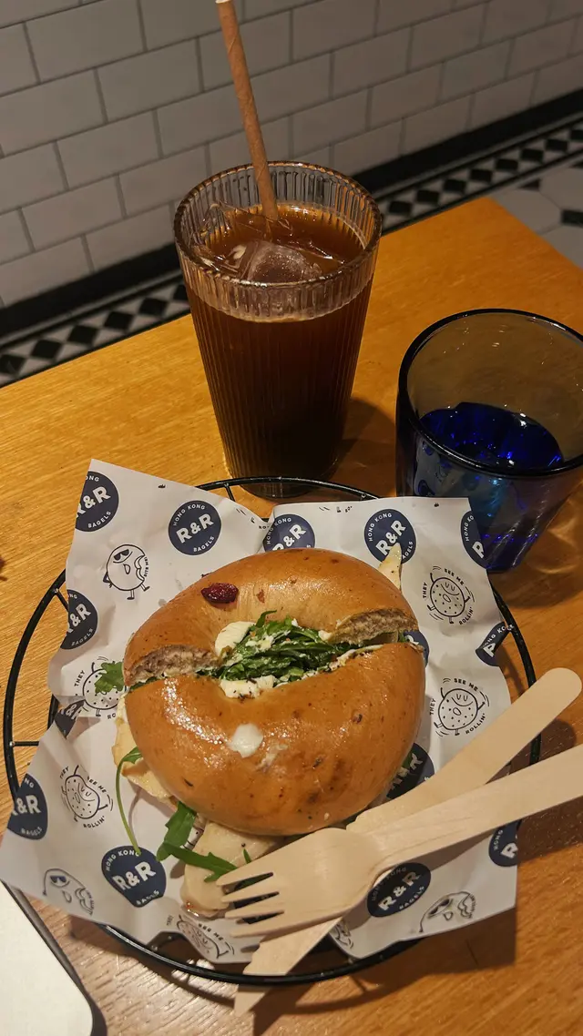 話說前排不斷尋找正宗/ 好味嘅bagel店 去完schragels就到r&r 店面唔係好容易搵 係中環D巷仔入面 但係都好多附近返工嘅人買或者食完返去個環境我幾鍾意!有幾張面對open kitchen嘅長吧台 可以坐沙發又可以有超闊台 方便食完做野/溫書!🥯the hampton💰95主要係有雞胸肉 芝麻菜 醬汁就有青醬 camembert cheese同creamcheese 仲有小小甜味來源於walnuts同sundried cranberries!Bagel可以自己揀口味 我永遠都會揀cinnamon n raisin(雖然唔鍾意raisin但永遠都會為肉桂而揀呢個)首先講下包個質感 望落都係好紮實個D美式bagel 個面好脆好光 好方便咁切開一半 咬落去麵粉感比較重 回彈力唔高但好明顯係幾厚嘅bagel類型!雞肉同青醬嘅搭配係無敵好味 超級清新 而cranberries同肉桂提子bagel嘅甜味都好相似 好夾!凍americano就偏酸 有小小渣但都可以接受!整體環境都啱坐耐D做自己野 有張大梳化可以同多D frd一齊食n傾計!…查看更多
