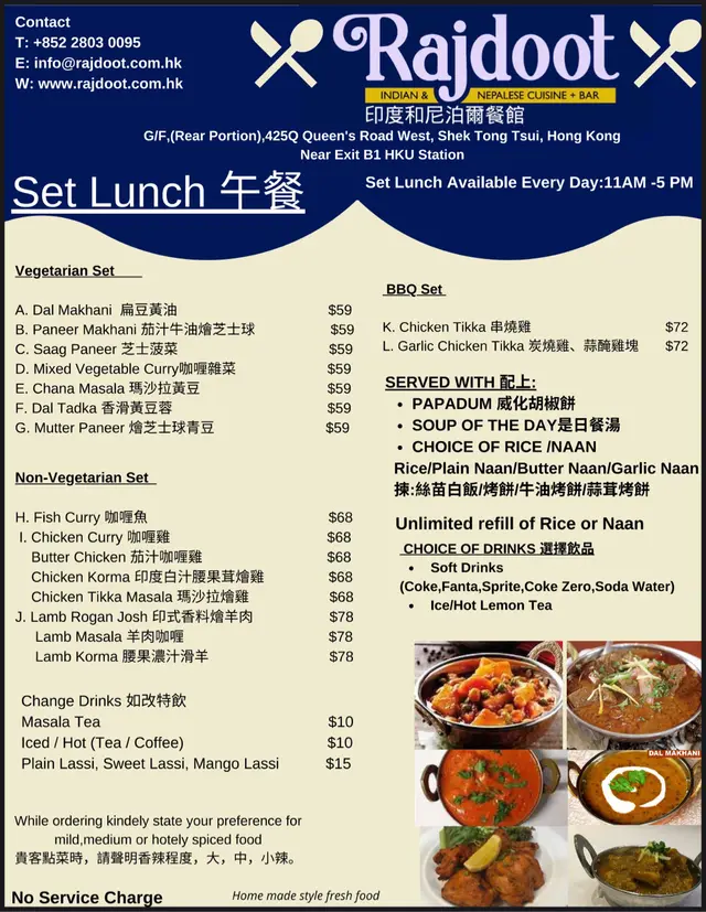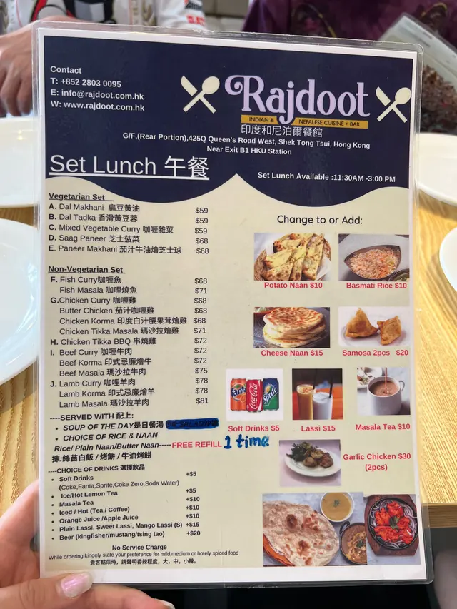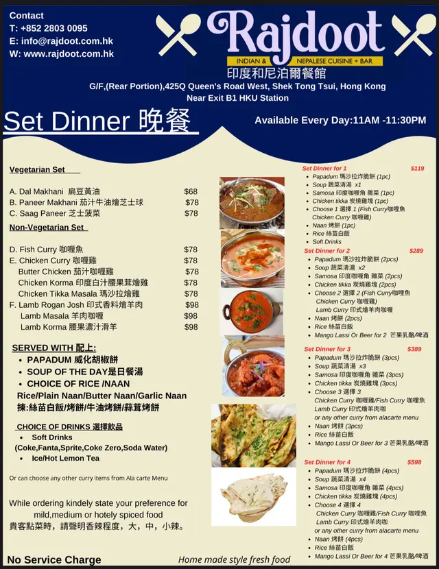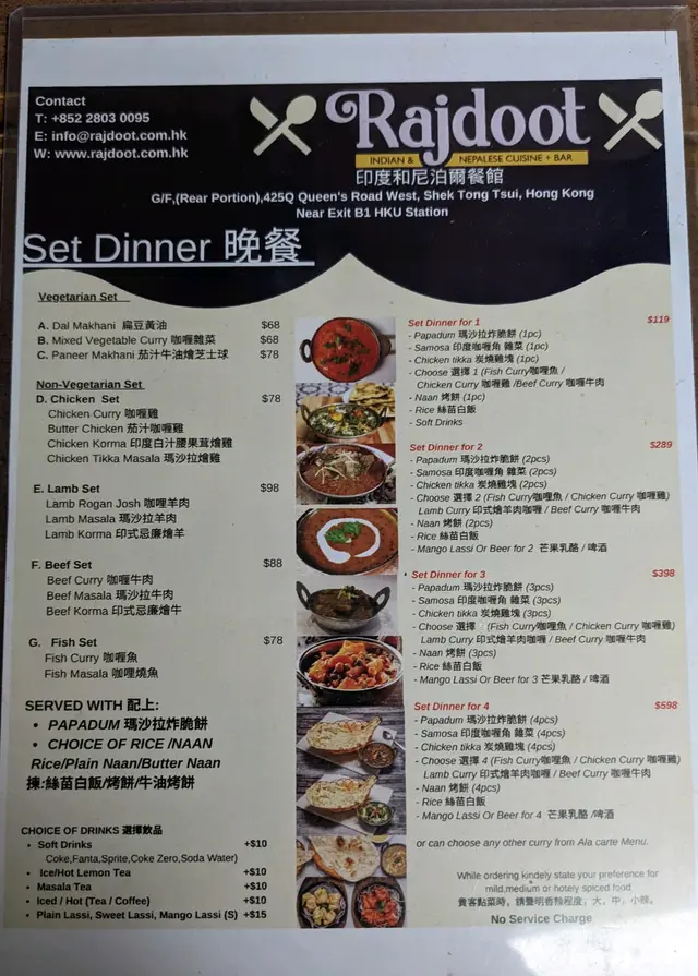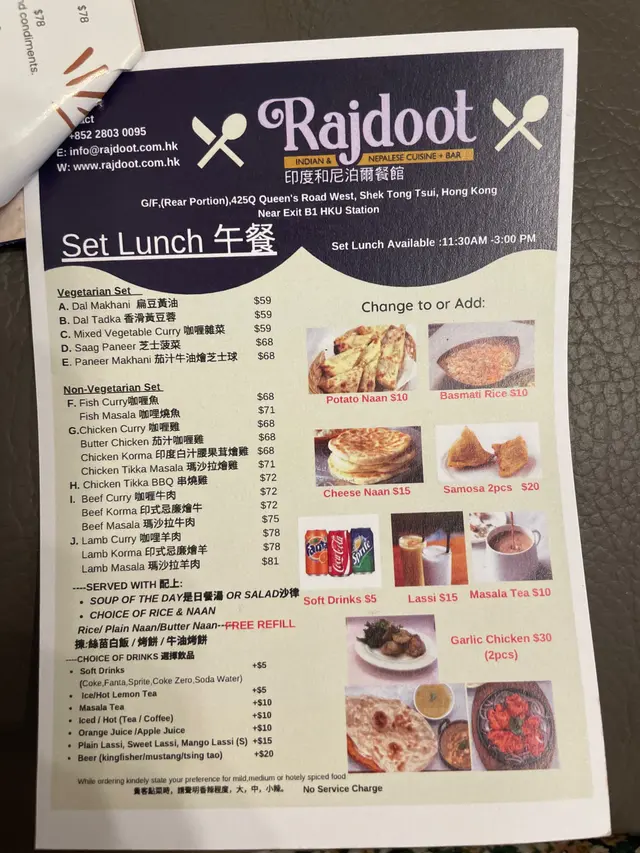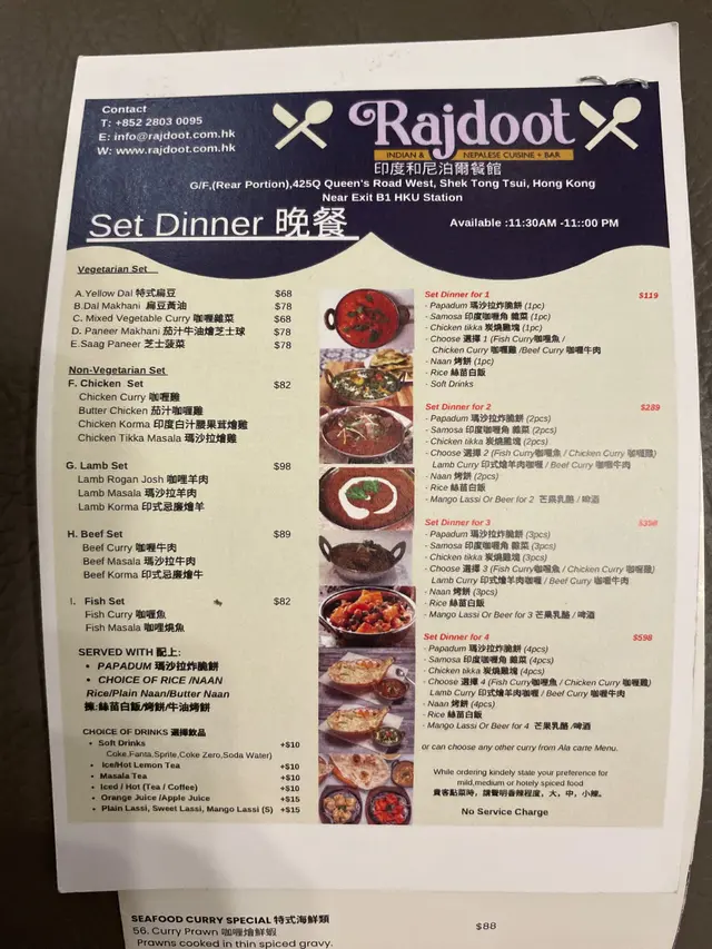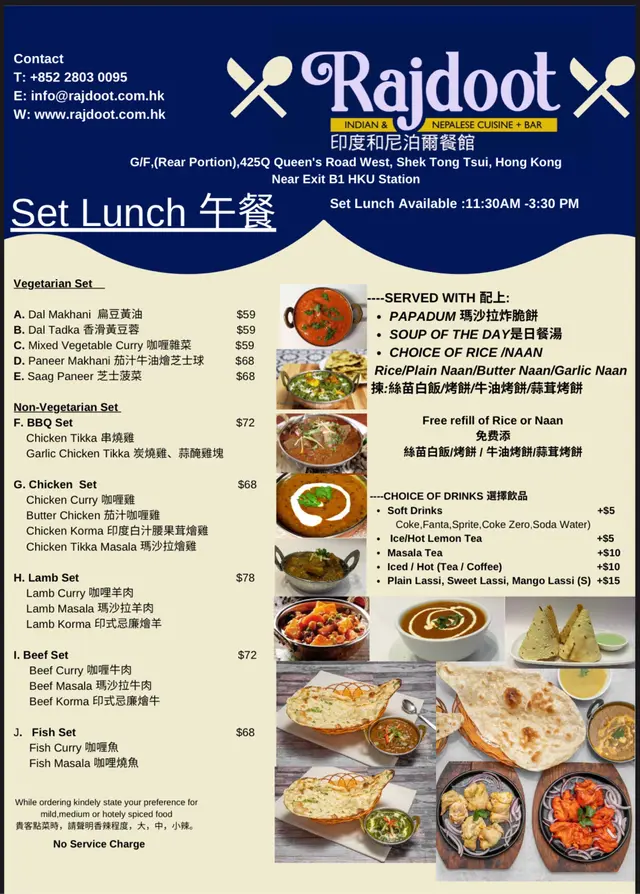 Rajdoot Indian & Nepalese Restaurant (西环) 网上订位即赚Rice Dollars 网址: https://s.openrice.com/QrLS0cLqA00 地址: 香港西環石塘咀皇后大道西425Q號地下後舖 电话: +852 28030095