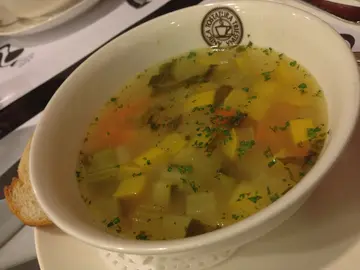 带好朋友MAGGIE睇物理治疗,顺便俾保单佢签收,MAGGIE问我知唔知有间餐厅因为拍毛记套「真相」而红左,叫我去试试。先饮左个菜汤,觉得几新鲜几FRESH,都唔错.CHEEZE PIZZA, 都几香脆,不过唔系好有浓郁嘅芝士味道,可能我中意浓味嘅CHEEZE所以我觉得只算一般.看报导,可能是晚餐比较吸引,也听说咖啡不错,找天再来试试。