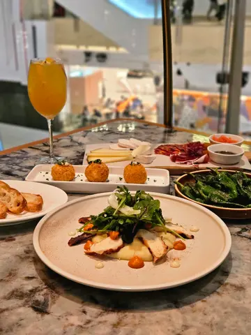 星期日在尖沙嘴圆方看了差不多三小时的早场电影!肚子饿得作响⋯知道圆方有间西班牙食肆RICO RICO ,在OpenRice 订座会有拼盘优惠,但见他们的服务态度在众多食评中一直被批评, 所以并没有预先订枱,但今天真的好想来一顿西班牙🇪🇸菜!所以还是直奔餐厅去😆店员直接带我们入坐最受欢迎,可远眺楼下溜冰场的卡位雅座!但一坐下来,觉得好吵耳😅就自行移动到内堂桌子🤭服务员也很合作地主动来帮忙🙏🏻餐厅竟然星期天也在做午餐买一送一优惠⋯现今香港食肆真的难做🥺但假期要吃好的,就不点任何套餐😜首先要了一份好划算的全日free flow($158 90分钟) 所以要先来三个下酒菜香醋西班牙青椒🫑$78黑醋是分开另上的,可自由不蘸上,我不爱沾黑醋,因为就是要尝灯笼青椒那天然微微苦涩和带少许青草的味道😜好好吃 😋小食拼盘$198拼盘有三只烤鸡中翼、一件蟹肉饼、两件芝士炸青椒和紫菜炸鱿鱼及炸薯条!要数紫菜炸鱿鱼最好食,紫菜好香,粉酱不算厚,鱿鱼有咬口👍🏻薯条就差些,炸得过透了,不是我爱的皮脆肉软,至于炸青椒,粉桨略嫌有点厚,但因为加入了芝士,味道蛮讨好的,还有的蟹饼和鸡翼都正常发挥,味道、口感不差😌地中海风味香烤肠拼盘 $158欧洲香肠一直是我的最爱top one😍由盘肠、脆皮波波肠、到芝士、墨西哥青椒的爆汁弹牙肠,全部都觉得好食🤤好好好满足😌唯一少少败笔,就是配上带咸味的黑松露薯蓉⋯变成咸上咸😅还是依传统配上腌椰菜来解咸腻更好吧!主食叫了最有代表性的西班牙海鲜🦞炖饭红虾大蚬牛柳炖$358炖饭热腾腾上桌,好香!先尝红虾,可能炖煮关系,有一点点过「老」,弹牙感略逊,但虾肉入味,接著是放上香料一起烹调的大蚬,口感正常,能保留不腥鲜味,反而想不到牛柳的熟成度,在炖煮下仍然可以掌握到不错,口感仍然嫩滑带粉色,又不会有我最怕的血腥味🤭最后当然是好重要的炖饭😆饭粒轻微湿润,海鲜味好浓郁👍🏻再配上红、黄椒和香草一起进食,令口感增添了少许层次感,好吃到让我们清盘😋😆真的有点水准呗👍🏻又是咖啡来结尾的时候😌向服务员说明要一杯面层泡沫,下层black coffee的正宗cappuccino,不错👍🏻好香浓!我们叫的不是套餐,所以除了香醋青椒和小食拼盘,其余菜式都是制作需时,肯定不是预制菜,均热腾腾上桌!总括来说我们今天的食物有点质素。至于服务,不知是刚巧,还是碰上非繁忙时段,又或是服务员在改善中⋯就算称不上好服务,也不至于给劣评!他们态度上都是友好,也有主动服务每枱客人所需。希望RICO RICO 多留意食客评论,努力去改善,让餐厅能在逆境中生存,我可以多间方便又不走高档的西班牙餐厅选择😆…查看更多