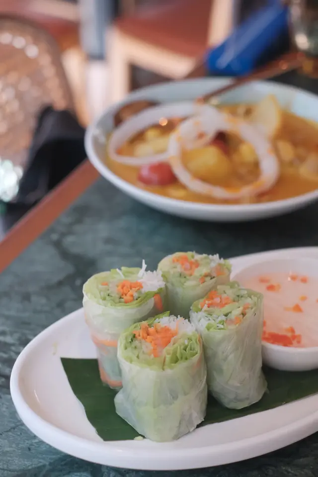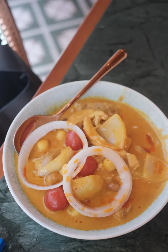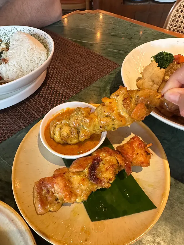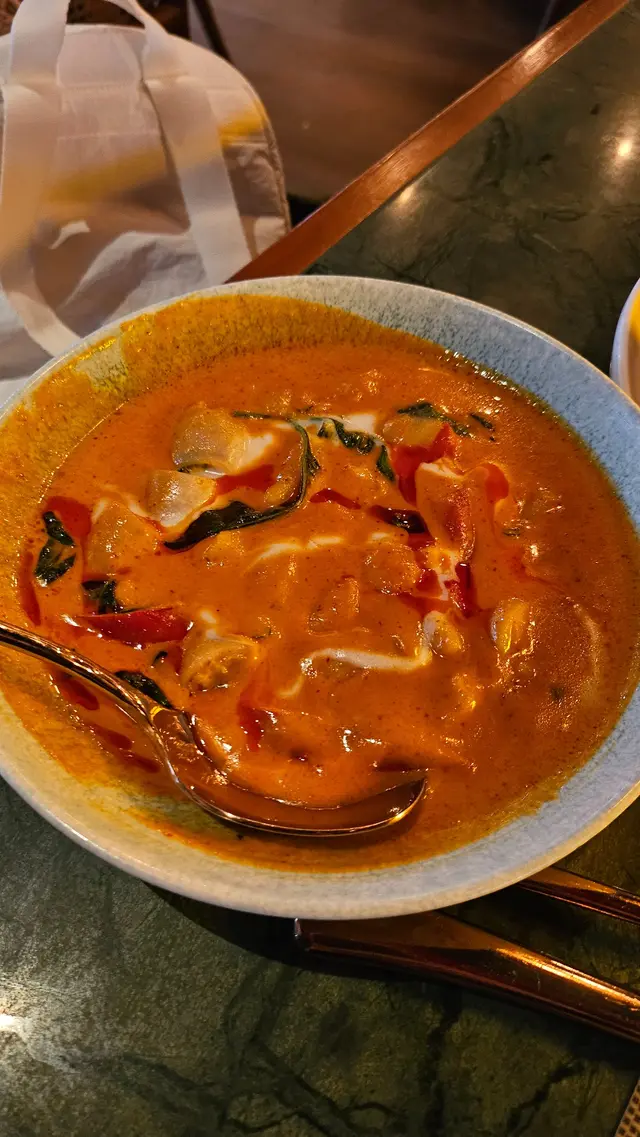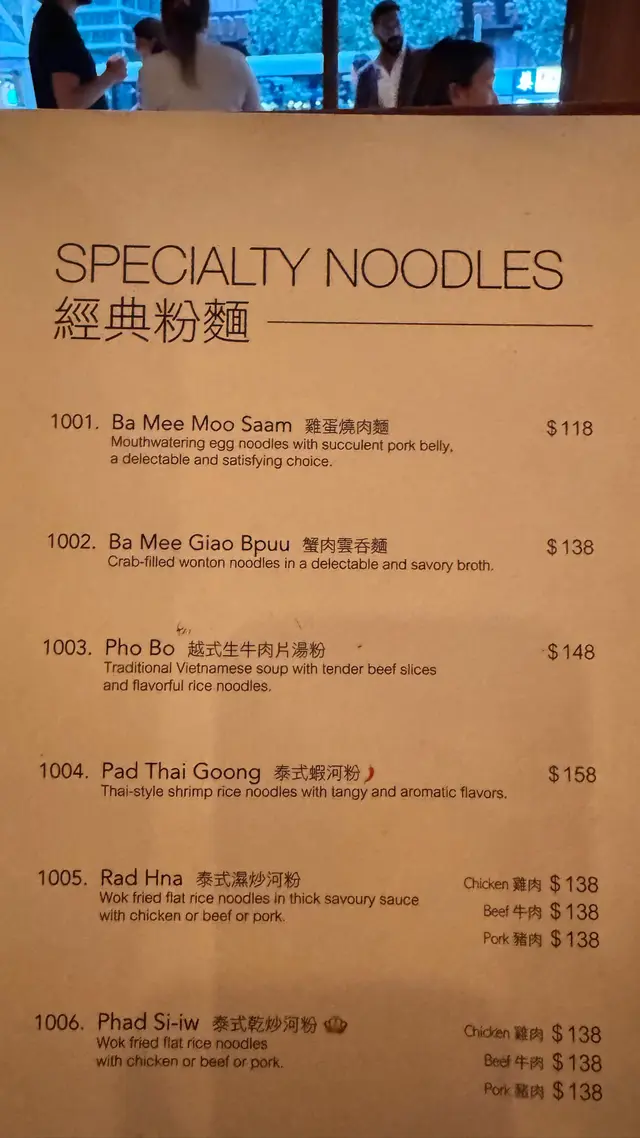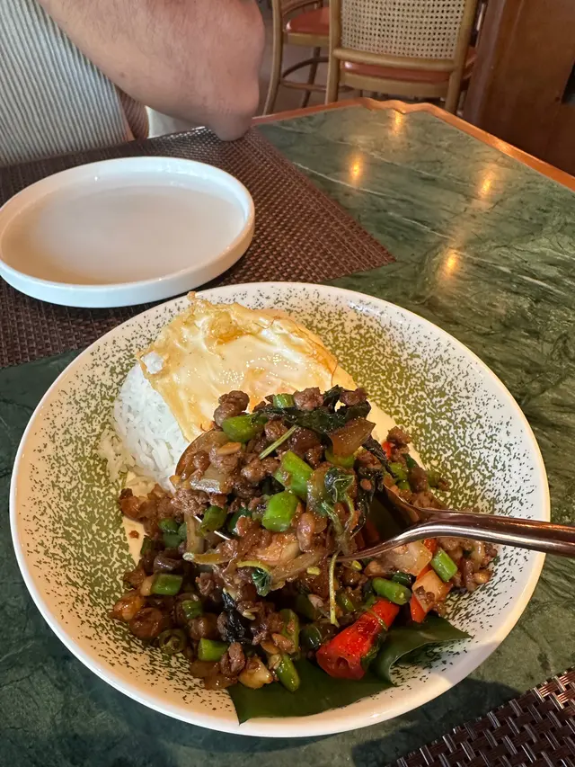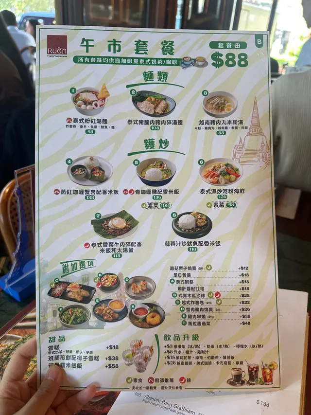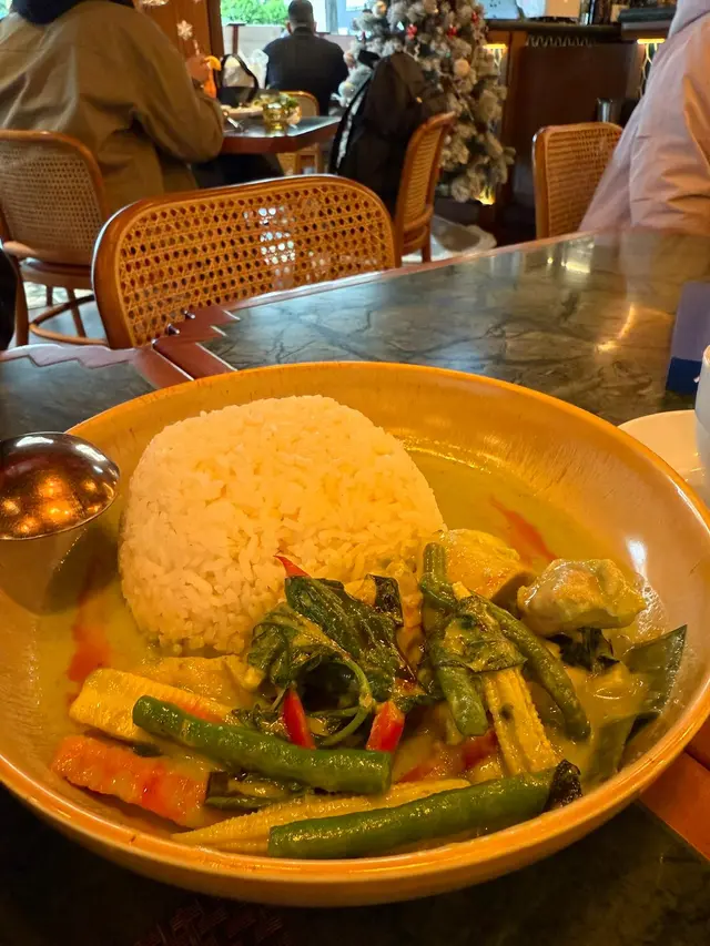 今日行尖咀,經過間半open area 嘅泰國餐廳裝修幾靚,已經有晒聖誕裝飾,好有氣氛,想感受一下,入去試!裏面座位寬敞,可以坐室外或者室內,我哋揀咗室內,可以望到更多精緻嘅聖誕裝飾!雖然係泰式,但有啲西方風味,吸引咗唔少外國人來食,叫咗幾樣嘢食:Chicken green curry with steamed rice + soup of the day + Vietnamese coffee青咖喱唔會好辣,少甜,冬陰功湯,紐西蘭花,粟米,味道好入味,算係濃味,好足料!雞肉厚切,都幾嫩滑,加埋啲菜配料,朔晒啲咖喱汁,好食!😃Pad krapow nua + prawn cake + latte 香葉牛肉好香,帶少少甜同辣椒,加起上嚟令成個飯都好滋味!蝦餅份量好大,薄餅啖啖肉,爽口彈牙,甜酸醬,點綴得10分好味道!Khaw phad poo 蟹肉炒飯好多蟹肉,上面仲有蛋黃蓉,融入啲炒飯裏面,特別香蛋黃味,啲飯粒粒分明,好食!Sate Ruam Mit ( chicken, pork , beef ) 串燒有香草味,三種肉都唔算醃得鹹,雞肉份量都好大,雞肉嫩,配合佢特製嘅醬,有啲花生味,好特別!牛肉豬肉冇臊味,烤到原汁原味,點埋佢個醬,都食到好飽😆…查看更多