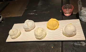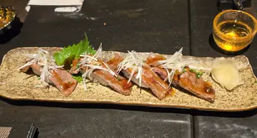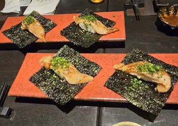 有时候朋友聚会不想被餐厅用餐时限控制著,又想去比较安静一点的地方,这家日式餐厅是一个不错的选择,有包厢之外,一般用餐区的间距也很足够,装潢气氛都很舒适。这里主要吃串烧,每日也有几款特别推介,大家也可以问店员参考,大部分串烧最少要点两份,四个人来吃的话问题不大。是日推介的鹅肝福袋是很新鲜的组合,咬开是很有咸香的鹅肝(很饱满),是非常邪恶的组合,可以挑战一下;伊比利亚战斧猪鞍的猪肉烧得不错,猪肉不会太难咬而且散发浓郁香气,份量足够四人。沾蛋浆的鸡肉软骨烧得咁刚好,酱汁味道浓郁,免治鸡肉肉汁满满,有一人一条也不够;牛脷芯口感和调味都做得不错,味道浓郁,是呼叫酒的味道🤣喜欢吃蟹的话甲罗烧也可以点一份,店员会在席前烧,海胆和蟹膏的完美组合余韵悠长;荔枝豚肉卷的荔枝肉特别清甜,和散发油香的豚肉一起吃完全没有腻感~好吃。另外还点了卖相好吸引的🔸烧饭团 和🔸虾味噌杂菜稻庭乌冬,前者烧得刚刚好,有焦香但不会太硬;乌冬汤底有樱花虾味,颇有鲜味,也很爽口,两款都值得一试,🔸自家三文鱼茶渍饭让我们吃到停不下的还有🔸芝士年糕,外脆里面的芝士依然是有拉芝效果,好吃😋…查看更多