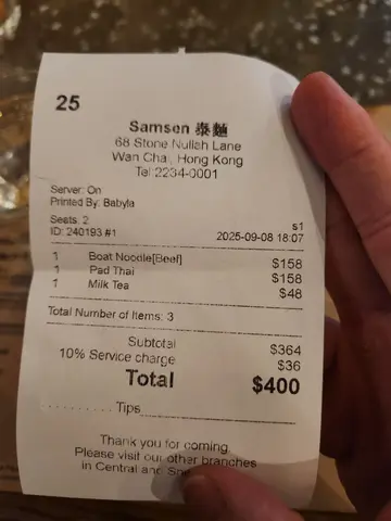 @samsenhk📍Samsen 泰面石水渠街68号地舖🐮🍜招牌泰式和牛浓汤粉 $158🦐🍝泰式虎虾炒金边粉 $158🧋泰式奶茶 $48今日同女朋友收工去食泰国菜,好彩我地大概6点就到,餐厅已经唔少食客😲我地坐咗阵就开始要排队啦🤣餐厅嘅装修都几有风味,有泰式大排档feel,高楼底装吊扇,同埋墙身有啲怀旧嘅摆设❤️不过怕热嘅朋友要趁呢排天气开始凉去食😋夏天食嘅话会有啲热🤣汤粉🍜嘅汤底超浓超甜😍和牛🐮都非常嫰😋炒金边粉🍝都几有锅气🔥虎虾🦐大大只又几多🤤女朋友几钟意饮佢地嘅泰式奶茶🧋唔会太甜😆虽然我钟意饮香浓嘅港式奶茶多啲,但我觉得佢地嘅奶茶都唔错😁食完饭仲可以去附近嘅合和商场行吓,最近有咖啡市集☕️❤️#bunnytummy_港岛#bunnytummy_湾仔#bunnytummy_泰国菜#香港foodie #食好西 #香港美食 #泰国菜 #泰菜 #高质泰菜#泰式奶茶 #padthai #打抛饭 #泰面#hkfoodblogger#hkfoodie #hkig #香港好去处 #拍拖好去处查看更多