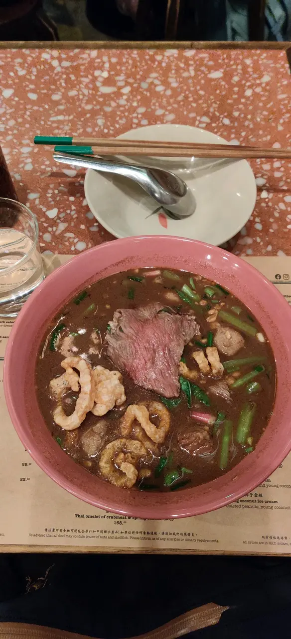 呢间餐厅一向繁忙时段门口都大排长龙,尤其夜晚人多到爆。环境简单又带泰式街头风,木枱同彩色装饰好有泰国小食肆嘅feel,虽然地方有啲细,但热闹气氛正正点,夜晚食饭再啱不过。🍽️招牌泰式和牛浓汤粉招牌船面汤底浓郁带酸辣,和牛半生熟嫩滑,粉面Q弹吸满汤汁,食落暖笠笭又有层次,泰式魂十足!汤底有柚子叶同香茅嘅香,啖啖都系鲜味,夜晚食热辣辣真系舒畅。🍽️隐藏Menu:椰汁斑兰汤丸汤丸系花生馅甜甜地,仲有几片椰子肉可以食,椰汁咸咸地带点咸香,可以平衡番口感,配上椰子肉增添口感,甜中带清新,收尾一流!花生馅浓郁同斑兰嘅清香混搭,夜晚食咁一碗真系解腻又开心。查看更多