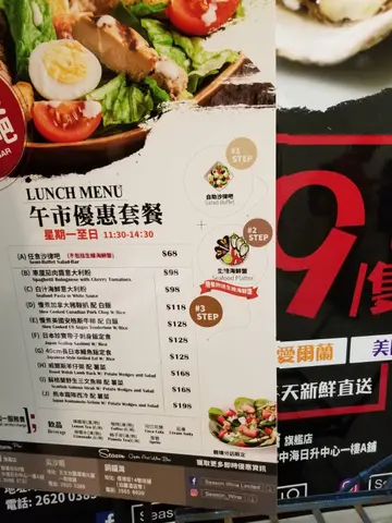 虽然食lunch时间得一个钟,又虽然我地4个女仔都系眼阔肚窄之人,但今日都同同事系season plus食semi-lunch buffet。主菜+沙律任食,价钱由98蚊到2百几不等。我自己就简左最平既pasta,因为主攻沙律,当然要食回本既Parma ham 同鹅肝酱,不过呢两样都refill得比较慢,好快俾人消晒。份量真系几少下,不过都岩既,可以食多d沙律,味道无乜惊喜,正常普通肉酱意粉。同事食呢个带子刺身丼,份量超大,食唔晒。另外仲送海鲜前菜,生蚝或冻虾加翡翠螺,生蚝细系细只无乜肉,我唔食既,同事话ok可以,呢个价钱无得投诉。冻虾反而几爽又甜,翡翠螺就有沙,要小心d食。…查看更多
