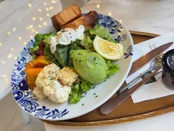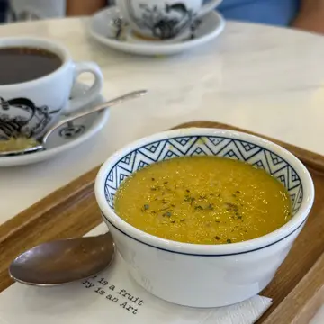 今日出咗科学园见到呢间个装修几靓上面全部都系灯泡门口仲有对龙凤喺度就即刻坐低想饮咖啡喺QR code谂紧食咩想叫个all day Breakfast 但系眼花花叫错咗个无肉版🤣不过错有错着,都几大份,两个人都够食椰菜花个汁酸酸地好开胃南瓜好甜个蛋仲好流心添最钟意系佢个无花果伯爵茶酱唔太甜,加落个面包到好好食加$5叫咗杯冻美式咖啡老公叫咗杯抹茶红豆豆花咁甜度适中 抹茶又唔会盖过豆花味😀😀