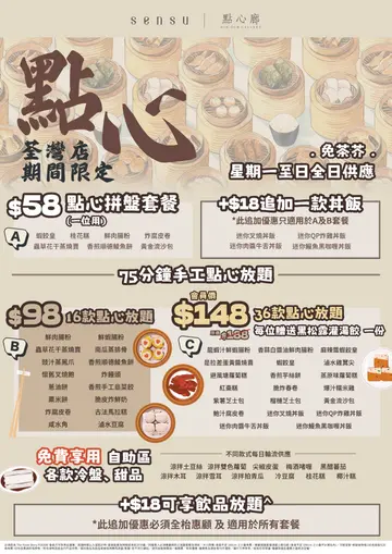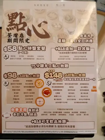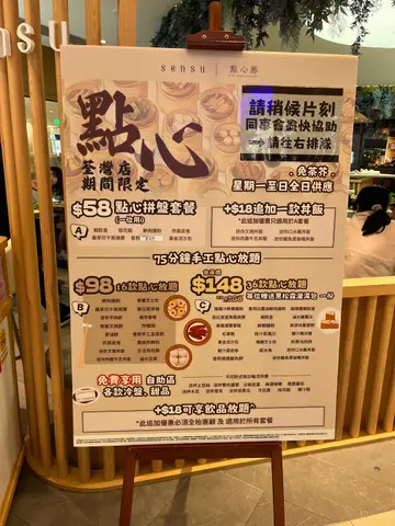 之前经过一次没有吃到点心放题,今次再到荃湾就去SENSU试试看。餐厅装潢整洁,落地玻璃光线充足,令客人坐得舒服。店员会问你试哪一个套餐,有$58,$98或$148,咁啱没有$58,就试试$98元16款点心的套餐。店员先端上荔枝乌龙茶,用上荔枝乌龙茶,感觉不错,口味清新。餐厅中间有一个自助吧,有一些沙律,甜品,青瓜前菜等。问心,可能因为已过午饭时间,余下的前菜不多,质素就一般般,算是开胃前菜还可以。客人可选择用餐牌或电话扫描qr code落单。怕一个人食唔晒,先叫了五个点心。迷你叉烧饭。叉烧比较干身和瘦,可以改善炸鲜奶。除了皮炸得比较黑之外,算脆和好吃虫草花蒸烧卖。六角蒸笼比较特别,烧卖质量还好樱花虾肠粉。虽然肠粉内没有樱花虾,是碎碎的舖上面,口感和卖相都有惊喜。炸云吞,稍为硬蒸排骨。就不算太特别整体来说,以快餐形式提供点心放题,性价比还算不错,三五自己喝喝茶,点几款点心,都可消磨一个下午。店员话暂时点心放题到1月19日,之后公司未有通知。