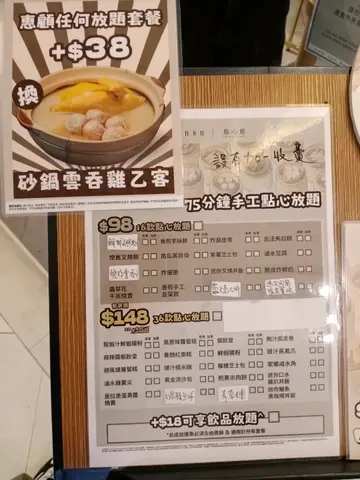 首先是 $148 元放题没有 36 款点心选择,有点失望。其次是上点心有点慢,首 30 分钟只上了 3 碟。明白晚饭时间人多点单会忙,但限时 75 分钟过了半小时只吃了 3 碟,还有 45 分钟可以吃多 4 碟 ?放题任食?? 万一点心迟些送到呢? 吃不完每 100g 收费 $20。于是等,点心慢慢的上来。过了 45 分钟没吃饱,最后半小时不管了,什么凤爪排骨都点,总不能吃放题没吃饱回家再煮面食。竟然,最后点的立即送上来,第一个点的虾饺王反而还未见影。75 分钟准时叫埋单,还有 3 个点心未上。付了钱后,那虾饺王就送来了,哈!这个体验,唉!