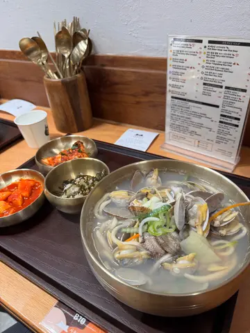 之前经过呢间韩国餐厅其他分店,成日都排长龙,未有机会试。平日夜晚黎到炮台山分店,终于唔洗排队都可以试到呢间人气餐厅啦。我叫左一个蚬汤面,除左有碗面,仲有一小碗饭,泡菜同腌萝卜。蚬嘅份量非常多,食极都仲有,超出我预期。每粒蚬都好大粒肉,亦非常鲜甜。面条系新鲜制作,食落非常有弹性,唔会淋晒,系我钟意食嘅质感,汤底嘅蚬味十分浓郁。呢个餐性价比非常高,唔单止份量充足,价钱亦合理,值得之后再黎试埋其他菜式!