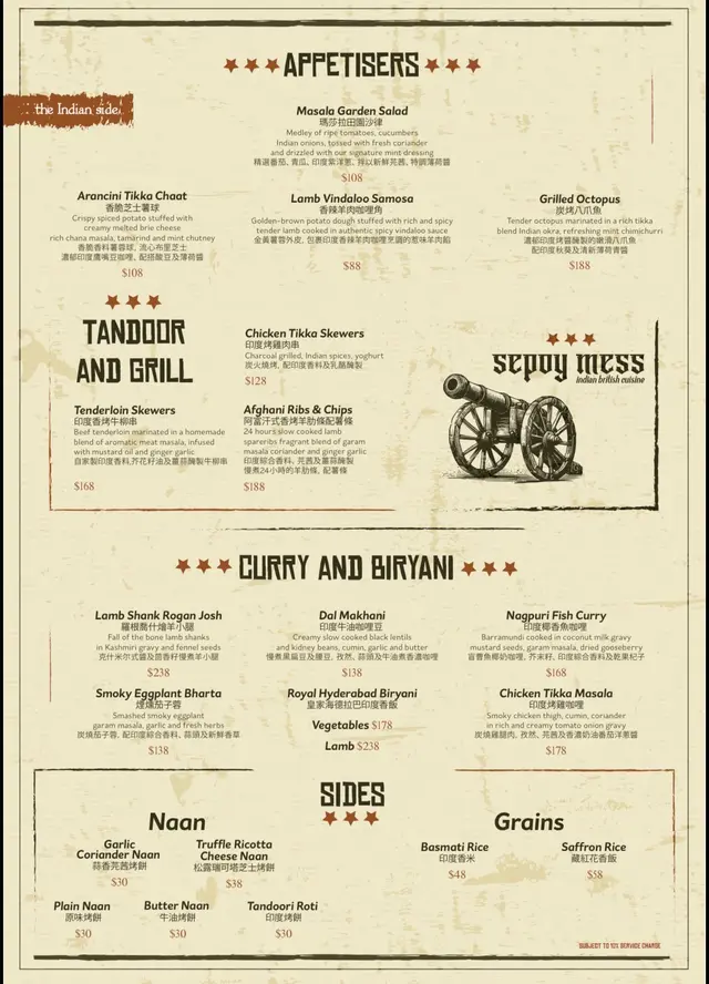 餐厅装修有啲木系设计加军事元素,气氛chill又有格调,啱晒周末慢慢叹。菜式走英印fusion路线,香料味够、摆盘靓,食物有惊喜。🥗 Masala Garden Salad 前菜沙律清新开胃,青瓜、番茄、洋葱加香料酱,唔会太抢味,啱晒热身。🦐 Prawns Pakora Basket 炸虾外脆内嫩,香料味唔太重但够香,配埋酸辣酱一齐食好惹味,唔会太油腻,几啱配杯Gin Tonic。🍛 Chicken Tikka Masala 主菜重头戏!鸡肉嫩滑,masala酱浓郁但唔腻,香料层次分明,捞饭或者捞naan都一流,食到停唔到口。🫓 Garlic Coriander Naan Naan外脆内烟韧,蒜香加芫茜味好突出,捞酱一齐食真系冇得输,系成餐嘅灵魂配角。🍮 Sticky Toffee Pudding 甜品系拖肥糖布甸,热辣辣上枱,外脆内湿润,配雪糕做到冰火交融,朱古力味浓但唔死甜,食完超满足。整体感觉:香料味够、环境舒服、食物有诚意,甜品仲系收尾王者。下次想叹英印fusion,Sepoy Mess可以bookmark低,值得一试!…Read More