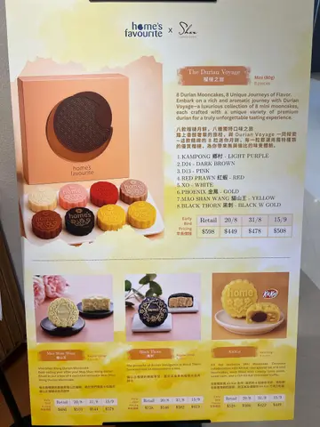 😍最近喺北角汇第二期可以揾到一盒超精致嘅榴梿冰皮月饼——Home’s Favourite同Shar Confections嘅联乘系列「榴梿之旅」,一盒八款颜色鲜艳嘅迷你冰皮月饼,每只都系用唔同顶级榴梿款精心制作,口感丰富层次多,系榴梿控嘅必试!八款颜色分别1. 乡村KAMPONG(浅紫)— 呢款冰皮月饼带有淡淡花香同榴梿嘅馥郁香气,口味层次丰富,好似踏上原始乡村之旅。 2. D24(深啡)— 榴梿中的经典,味道浓郁醇厚,甜度适中,非常香滑。 3. D13(粉红)— 带有果香同微微酸甜,适合唔太爱太浓榴梿味嘅朋友。 4. 红虾RED PRAWN(红色)— 用顶级红虾榴梿,味道浓烈且带果香,回味悠长。 5. XO(白色)— 呢款结合榴梿同XO酱风味,微辣又咸香,好有惊喜感。 6. 金凤PHOENIX(金色)— 奶香与浓郁榴梿融合,质感细腻滑顺。 7. 猫山王MAO SHAN WANG(黄色)— 榴梿皇后登场,香气浓厚,入口柔滑甘甜,超级惊艳! 8. 黑刺BLACK THORN(黑刺+金色)— 最珍贵嘅品种之一,味道浓烈层次丰富,绝对高级享受。🎐除冰皮月饼外,北角汇店仲有多款精致迷你蛋糕,口味多样,蛋糕做得细致精美,口感特别有惊喜。仲有多款曲奇选择,香脆松化,适合送礼或者自己叹。🛍️呢度嘅产品不论送礼定自用都好有面子,冇论你系榴梿迷定系甜品控,都一定会爱上。快啲去北角汇第二期度揾呢盒榴梿月饼同精美甜品啱啱好过中秋啦!