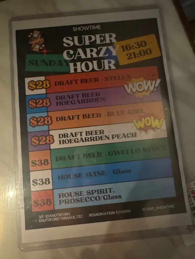 ShowTime Sports Bar (尖沙咀) 网上订位享低至7折优惠并赚Rice Dollars 网址: https://s.openrice.com/QrLS0P0S800 地址: 香港尖沙咀諾士佛臺10號騰龍閣3樓 电话: +852 23889050