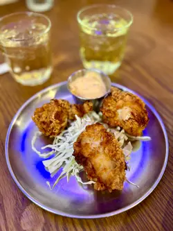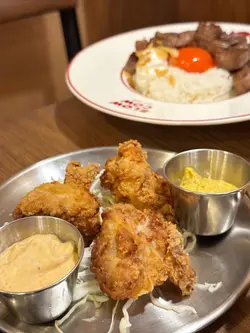 。日式炸雞,炸雞炸得恰到好處,外皮薄脆,雞肉嫩滑多汁。雞肉預先醃制過,唔洗點醬已經好夠味。店家搭配咗兩款醬汁,咖喱醬味道特別,日式沙律醬酸甜適中,都同炸雞好夾