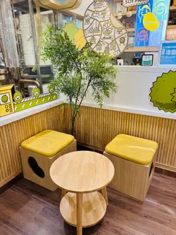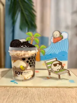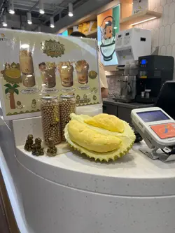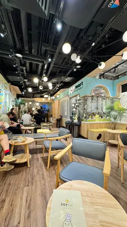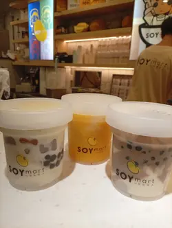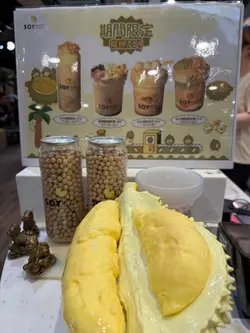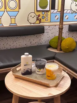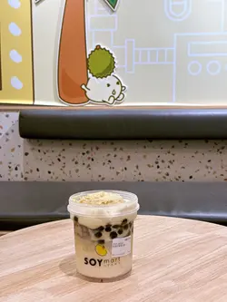 在摩士公園打完波,在地老友推介我們來到「樂富廣場」的「SOYmart by 豆乳狂人」吃個甜品下午茶,因為其甜品甚富特色,份量十足,加上以鮮製豆乳及豆花製作,更富營養:)。下午茶時段,都是些學生哥、銀髮族光顧的多,而且,外賣的也不少。店內裝潢骨子,地方亦闊落,一室淺木色系,予人感覺舒服悠閒。此外,正正推出一系列期間限定的榴槤產品,所以,店內有不少裝飾都以此為題,好些彩繪都頗得意,朋友是榴槤控,這系列的甜點是其必然之選