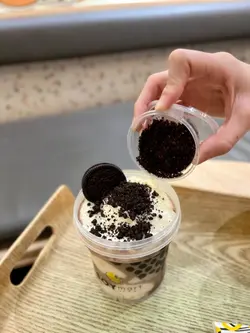 ,加上內有三色芋圓、小丸子、珍珠、豆乳布丁和榴槤奶蓋,下了特調椰奶,真是味道與口感也無所挑剔,實在豐富,超好吃喔