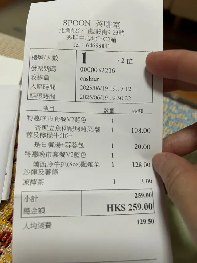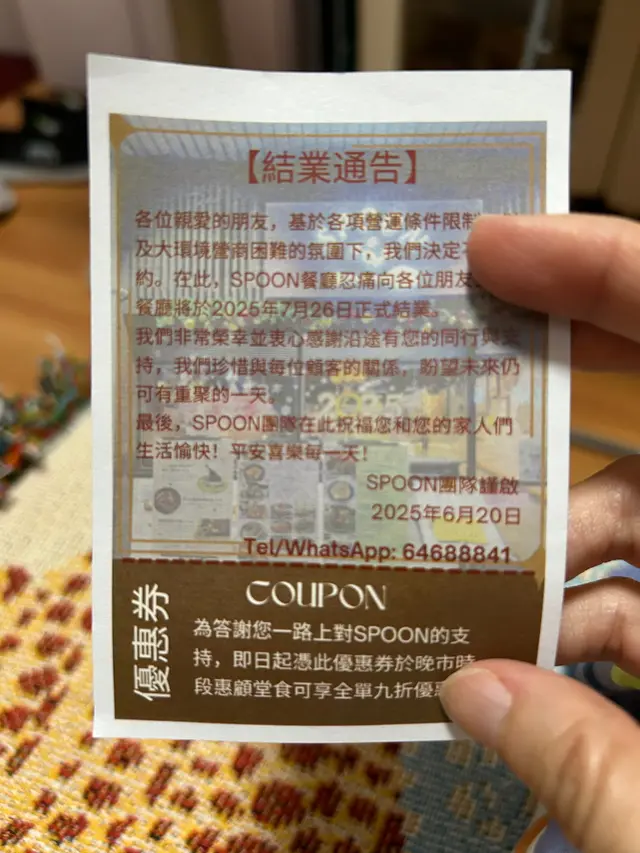 老公在炮台山上班,今晚打算接他放工兼吃晚飯,就預先search有什麼好評餐廳,然後選了這間在openrice和google都好評的spoon。要了2個晚餐:西冷牛扒配薯條沙律、煎立魚配扁意粉,另加$20有南瓜湯、蒜蓉包。環境是舒服的,服務也不錯,不過味道、食材質素才最重要。南瓜湯很濃,2個人share剛好。七成熟牛扒中央粉紅,雖然有少許筋,但整體有肉味,軟硬適中,肉汁也很好味,薯條香脆,沙律菜也新鮮,這個晚餐性價比非常高!煎立魚厚肉juicy,如果可以煎香一點更好,扁意粉也不錯,這個set就比較清淡。這餐吃得滿意,心想以後一定會再來。付款時小妹給了我們一張九折coupon,原來上半部分是七月尾結業的消息!我們才第一次來,卻已沒有以後了⋯⋯不知為何忽然很感觸,對著小妹嗚咽著說不出話來⋯⋯明明環境好、食材好、味道好、服務好,晚市卻只有三枱客⋯⋯ (小妹好像說業主不租給他們了。)後悔沒有拍食物的照片。這一餐真是既滿足、又傷感⋯⋯七月尾前,我們一定會再光顧的!…查看更多