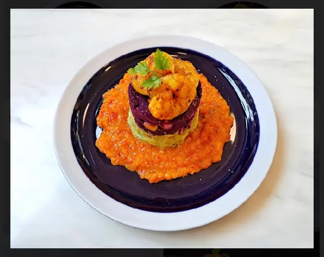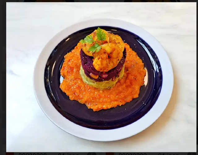 Grilld shrimp with Purple potatoes &avo. Tart tart