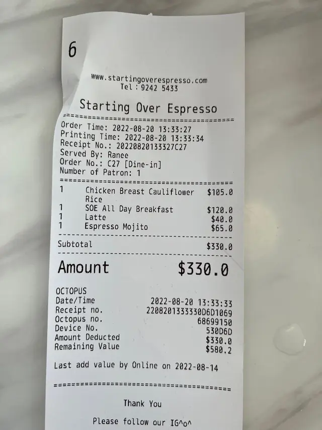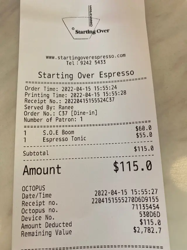 I decided to get a breakfast before I headed to Tai Kwun to meet up with boyfriend. Starting Over Espresso was just across the street. A perfect place to grab a bite.A typical coffee shop. Open kitchen with plenty of spacious seats.Menu is in English and Chinese. There is no 10 % service charge. You order and pay at the cashier where they will bring the food to you.I decided on a small latte ($45). It was a lot larger than a lot of small size lattes I've ordered at other places. A decent cup of coffee. Very nutty and smooth.As it was breakfast, I ordered a Healthy Breakfast Bowl ($68). A thick creamy Greek yogurt with bananas, strawberries and blueberries. Granola and walnuts with a drizzle of honey and dried mango bits. It was quite good. Fruit was fresh. I could have loved a bit more drizzle of honey as it was almost nonexistent. But otherwise healthy.A nice little coffee shop. It's not too busy and fairly quiet. Something that is good in the morning.…查看更多