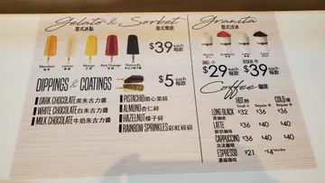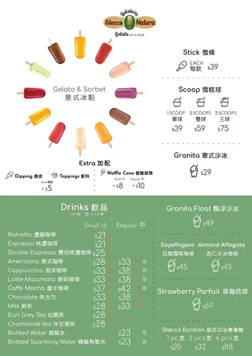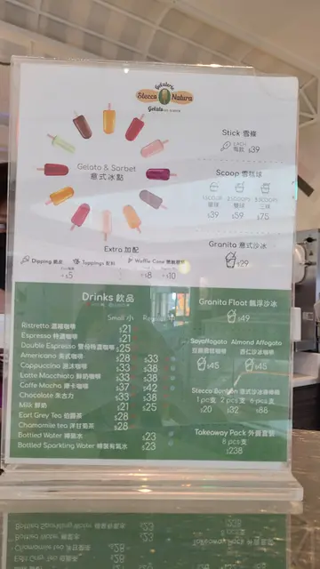 今日去咗山顶玩,黎咗呢间Stecco Natura食雪糕做下午茶。先攞雪糕,然后比钱。隔离有4张枱可以坐低食。雪条有8款口味,连哈密瓜同红橙都有。每条$39。我地拣咗较特别既杏仁同红桑子口味。加朱古力酱要加$5,加配料每样$8。朱古力有3款可选,配料就有4款可选。服务员即刻加配料比你,而且放系一个特制纸兜上面。雪条其实好鬼细条。红桑子雪条加牛奶朱古力加榛子 $52红桑子雪条真系好酸,个牛奶朱古力脆皮真系正,再加埋少少果仁真系一流。强烈建议要加朱古力同果仁。杏仁雪条加黑朱古力加杏仁 $52杏仁雪条味道就唔太出,不过好滑。个黑朱古力脆皮同杏仁又系好正。雪糕口味有9款,一款已清底。除咗生姜味道较特别,其他口味就普通d。三球雪糕球(豆腐,椰子,芒果) $753个雪糕球size正常啦,唔大唔细。雪糕质感较散,一d都唔滑,味道偏甜。3款口味我拣咗豆腐,芒果同椰子。豆腐真系好豆腐,芒果较甜,椰子都香,个人钟意椰子多d。总括而言,雪糕唔得,雪条好d,不过劲贵。…Read More