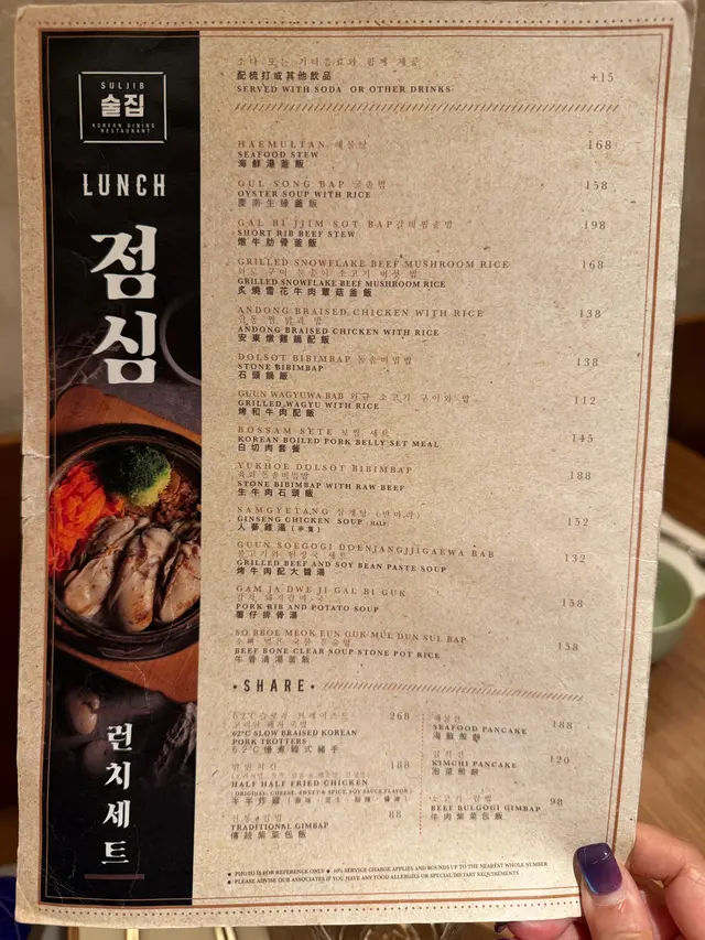 SUL JIB 술집 (铜锣湾) 网上订位享低至8折优惠并赚Rice Dollars 网址: https://s.openrice.com/QrLS0NVKB00 地址: 香港銅鑼灣勿地臣街1號時代廣場13樓1302號舖 电话: +852 35802798