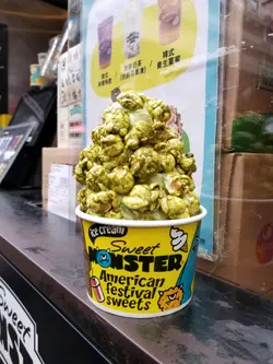 舖头唔系好易睇到,佢喺间时装舖嘅楼梯底,好多时由亚皆老街行去油麻地方向,好易行过咗。每次到旺角都食嘅雪糕,Jeju Green Tea Monster。佢嘅 Jeju Green Tea 雪糕好好食,甜度啱啱好,加埋得佢哋先有嘅 Green Tea 味爆谷,好好好好好味。