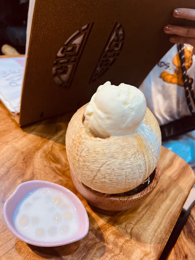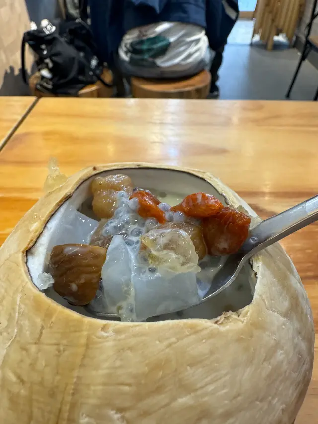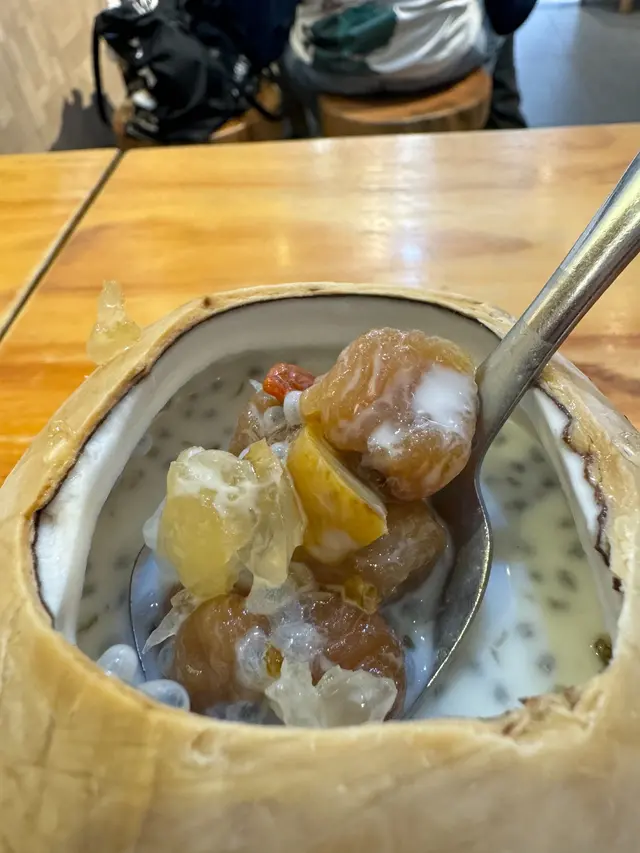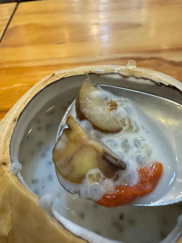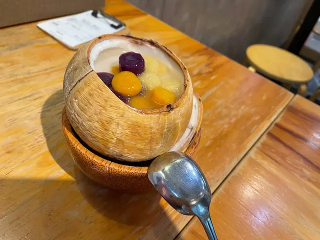 夜晚1030左右去到 啱啱好有位 入到去好快就order左熱嘅椰皇燉蛋白配芝麻湯圓小丸子隔離檯10分鐘後先到 但係佢地叫晒野食 都有椰皇 食曬走埋我地嘅椰皇都仲未到 🥲 隔左陣店員先拎張單黎話熱嘅椰皇要等多10分鐘先有😵😵 但係個陣其實本身已經等左超過十分鐘 後面檯仲話已經等左半個鐘😨😨之後終於到左 店員率先倒瀉左兩淡落黎檯同我地件衫😖😖😩 講返椰皇本身 裡面有裝滿嘅 唔係偷工減料 小丸子同湯圓都煮到好淋 鍾意有小小煙韌嘅可能會失望 但我ok嘅👌🏾 芝麻湯圓餡唔算好多 細細粒椰子味都食到 椰子肉都容易刮 而且唔會硬 夠軟淋滑溜嘅 overall不過不失 正常椰皇蛋白發揮 但係等太耐真係扣分😣😣查看更多