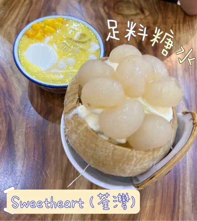 🦄Sweetheart💞門外好多刻畫椰皇既畫作🖼️,舖頭主打🥥甜品,推開木系裝修的店門,內裡係間溫馨小店,位置唔多有D迫,小編推介適合2-4人小聚🥥椰皇蛋白芋圓$58用原個椰皇盛載,一上枱就聞到椰香,配上燉蛋白,🍮口感嫩滑好肉咁布甸,入口即溶。甜度岩岩好,加埋煙韌既三色芋圓,Prefer match 👅!✨ 龍眼撈水晶粉$55水晶粉 + 🥥椰絲 +🍧 龍眼沙冰 + 椰果 + 牛奶布甸+小丸子🍧龍眼沙冰清甜,帶新鮮龍眼肉同椰絲增加口感,好少糖水裡面會有椰絲出現,多種口感同風味層層堆疊,水晶粉好透明好滑,小丸子好有咬口整體清爽又有驚喜👍!‘-‘-‘-‘-‘-‘-‘-‘-‘-‘-‘-‘-‘-‘-‘Sweetheart 📍地址 : 荃灣鱟地坊8號卓明大廈地舖🏰環境: 7/10🙇🏻‍♂服務: 7/10 💰價位: 低價⏰用餐時段: 宵夜‘-‘-‘-‘-‘-‘-‘-‘-‘-‘-‘-‘-‘-‘-‘#為食控 #hkfoodie #hkfoodalog #hkfood #foodiehk#食好西 #人氣美食 #糖水 #串燒 #荃灣 #溫馨小店查看更多