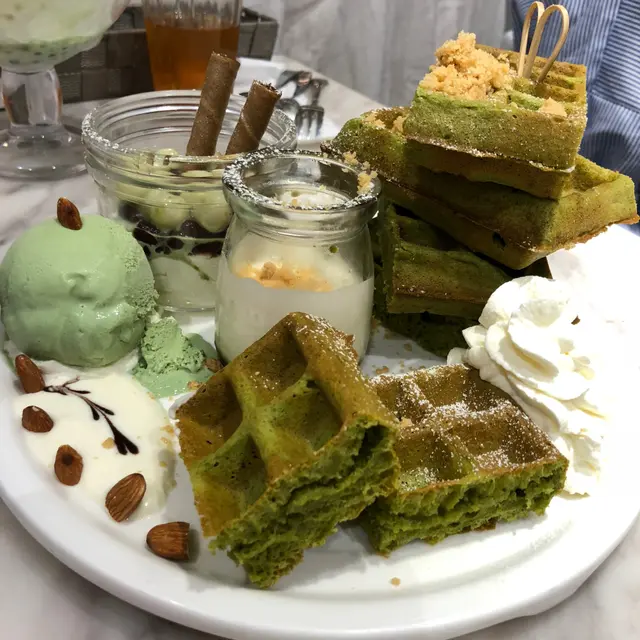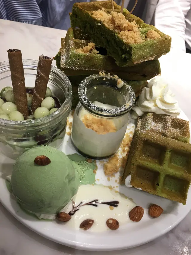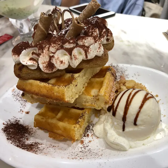 在又一城逛街,經過這間餐廳,被Menu的甜品吸引了,決定一嘗它的滋味,點了一份精品士多啤梨窩夫($78),及一份朱古力棉花糖三文治窩夫($78)。士多啤梨窩夫外脆內軟,帶有蛋味和奶香,士多啤梨雪糕有粒粒果肉,甜度適中,奶油奶香濃郁,口感綿密,加上酸酸甜甜的士多啤梨,窩夫感覺不會油膩。朱古力窩夫的朱古力味香,味道不太甜,和溶了少許的棉花糖一起吃,窩夫平衡了棉花糖的甜度,旁邊的焦糖碎口感脆口,味道甜中帶甘,不過窩夫略嫌有一點乾,搭配雪糕一起吃會比較濕潤。甜品份量頗足,味道亦不錯,下次可以再吃,順道賞嘗主食。…查看更多