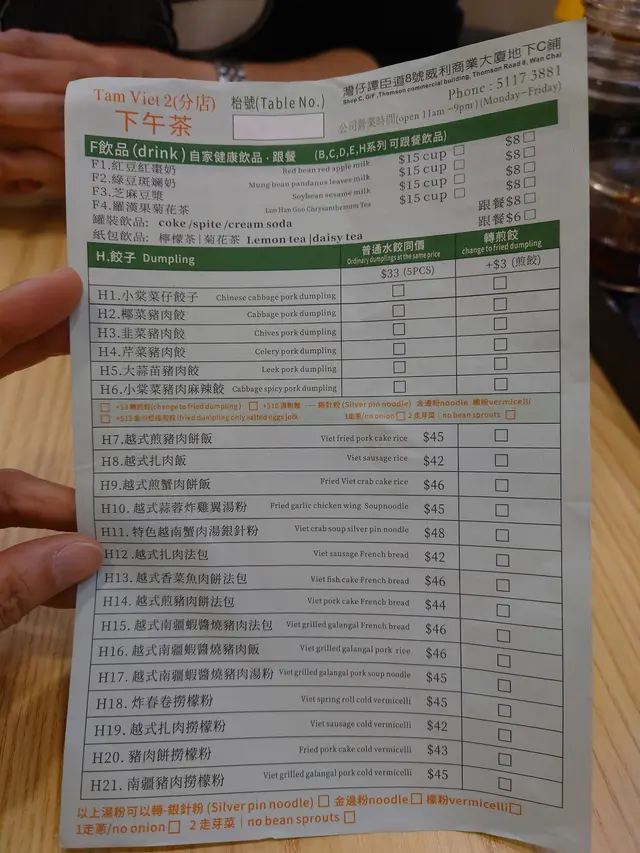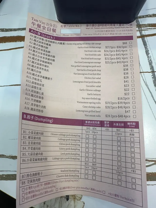 Tam Viet 2 Dumplings (湾仔) 网址: https://s.openrice.com/QrLS0POKC00 地址: 香港灣仔譚臣道8號威利商業大廈地下C號舖 电话: +852 51173881