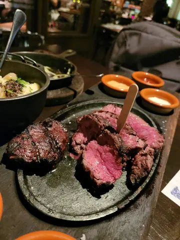 晚上 在四季 酒店 参加了一个 品酒会, 所以在附近找间餐厅吃饭。 女朋友知道我喜欢吃扒,又未试过阿根廷的牛扒, 所以就带了我来。点了一个Old Style Provoleta, 用烧热了的铁铸pan盛载著烧溶了的芝士,配著脆口的法包,一乐也。不过芝士味偏咸。牛扒就简单地点了一个12oz的Fillet,作为餐厅灵魂,牛扒当然非常美味,牛味浓郁。 另一个特点是供六种酱汁, 可以一次过满足六个愿望。就算一班人吃也可以开心分享。作为一个好酒之人,即使要参加稍后的品酒会。我们仍然点了一杯阿根廷的Syrah 和一杯阿根廷的特色提子Malbec。 结论是即使在中上环一些比较好的餐厅,餐酒依然是酸度较高的货色。然后可能都开了一段时间,果味亦会相对失色少少。…查看更多