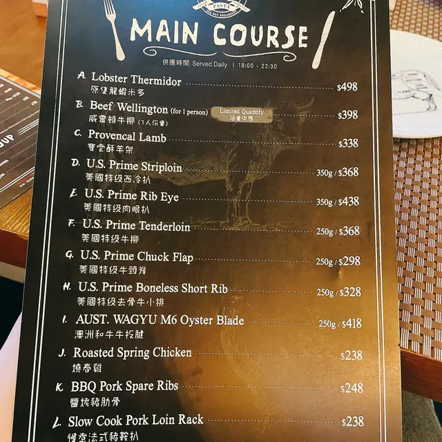 以招牌威灵顿牛柳作招徕的西餐厅,亦供应分量十足的意式及美式料理。而餐碟及墙上的牛肉部位图表,是店内的特色打卡位。
