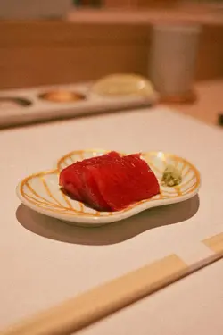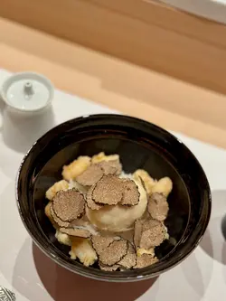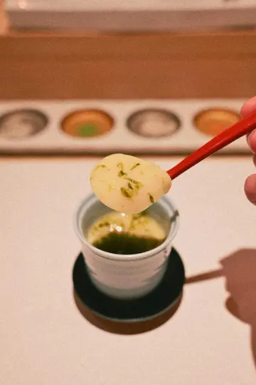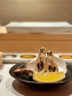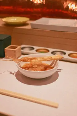 天妇罗Omakase在香港并不常见,位于中环的 天妇罗次郎 Tempura Jiro 由日籍主厨开设,自开业以来已是预约困难店,店面不大,一室木系枱椅与柔和灯光体现极致和风美学,江户前天妇罗以新鲜海产为核心,搭配季节性蔬菜,日籍主厨擅用不同面糊浓度,并根据食材特性调整油温,午市时段备有两款厨师发办料理,今次我就首尝每位$880 Lunch Omakase Course,调味包罗松露盐、绿茶盐、海藻盐、梅子盐和青柠,还有萝卜蓉天妇罗汁。酱油渍吞拿鱼赤身厚切刺身经过日式酱油腌制后,进一步提升鲜味,入口即化成一口鱼油香。花竹虾头外层经过热油的洗礼后,变成诱人的金黄色泽,入口卜卜脆,沾些海藻盐,咸度不会过重。花竹虾身分别有两种食法,薄浆低温油炸后外皮轻薄,保留虾肉的鲜嫩口感,另一款厚浆高温外层酥脆度高,和虾肉的弹性形成鲜明的对比。无花果、冬菇秋季正值盛产期,结合天妇罗的轻脆外层,冬菇肉厚弹嫩且富有嚼劲,散发菇菌独有的馥郁香气,无花果温热柔软带湿润感,炸后使天然糖分浓缩,味道更甘甜。秋刀鱼、虎耳草、酸汁萝白蓉配姜丝 秋刀鱼在日本料理中被视为秋季的象征,卷成圆饼状,外脆内嫩,肉汁被高温锁住,配上充满草本清香的虎耳草天妇罗和酸汁萝卜蓉,中和炸物的油腻感。高汤茄子表面洒满了轻薄的木鱼碎,遇到热气后摇曳飘舞,茄子细密软糯,尽吸高汤精华。沙锥鱼同样为当季新鲜食材,鱼肉肥美,柔嫩多汁,就连细小的鱼骨都可炸成天妇罗,份外脆口,呈现两种截然不同的质感。海苔茶碗蒸热腾腾的茶碗蒸蛋软软嫩嫩,犹如豆腐花般彷佛吹弹而破,可以清一清味蕾,实现和食的抑扬顿挫与有秩序的节奏感。三文鱼籽海苔、奈良杮子奈良柿子于秋季成熟,果肉软身甜度高,油炸过程会强化其清甜果香,薄脆的海苔天妇罗舖满色泽晶莹亮丽的三文鱼籽,粒粒脆感瞬间在嘴里爆开咸鲜滋味。海鳗、熊本栗子上碟时附上一条海鳗骨,不仅能展示食材的新鲜度,还可体现日式料理对食材的全利用理念,海鳗含有适度的天然油脂,肉质丰润,滴上青柠汁后,口感会更清爽也能消除腻感,将大颗饱满的熊本栗子炸成天妇罗后,突出秋栗的软糯与甜香。带子虾饼茶渍饭主食可以三选一,带子虾饼真材实料,新鲜爽弹,师傅炸好后放入清澈茶汤,瞬即冒烟,香气四溢,茶香清幽淡雅,顿时感到暖胃又充实。焦糖抹茶雪糕雪糕入口浓稠略带黏性,抹茶的清幽回甘与焦糖的温暖甜味相互交织,平衡了整体甜度。…查看更多