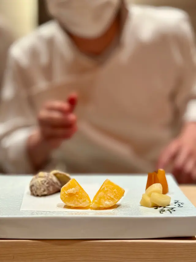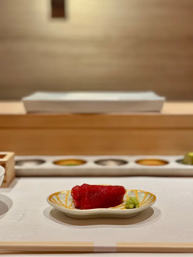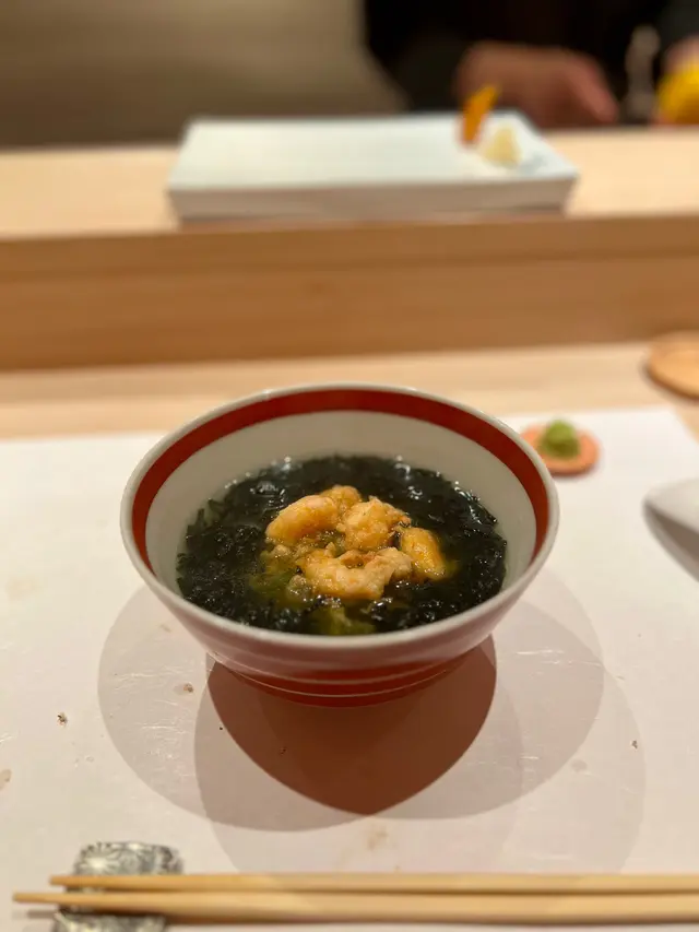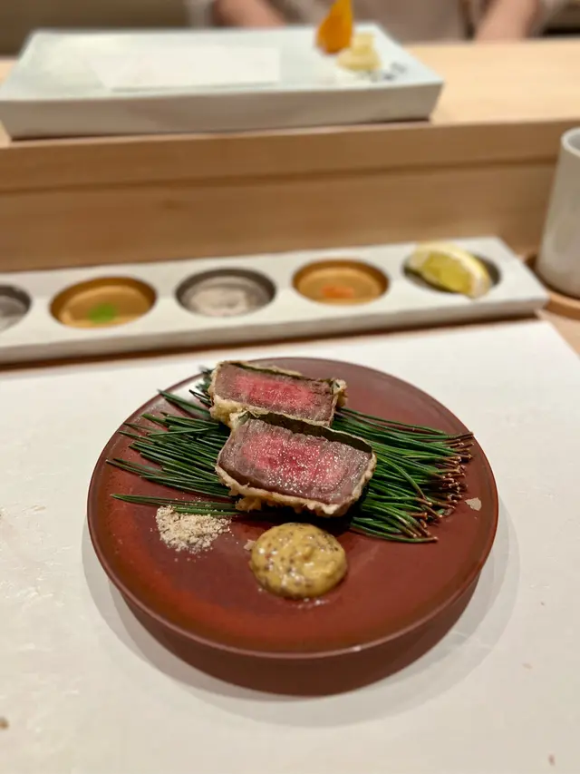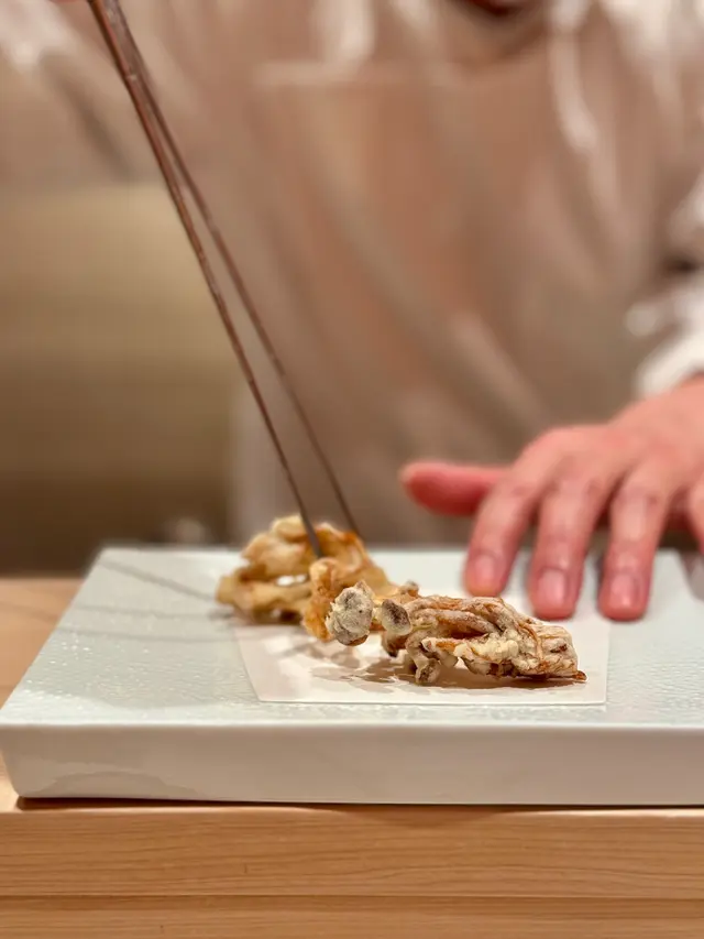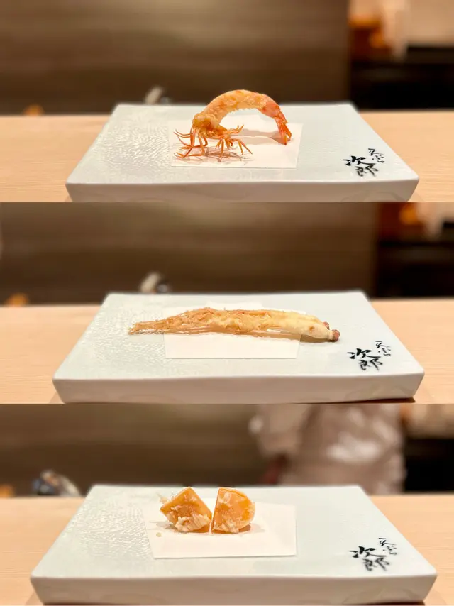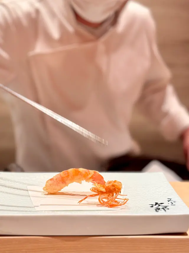天婦羅Omakase在香港並不常見,位於中環的 天婦羅次郎 Tempura Jiro 由日籍主廚開設,自開業以來已是預約困難店,店面不大,一室木系枱椅與柔和燈光體現極致和風美學,江戶前天婦羅以新鮮海產為核心,搭配季節性蔬菜,日籍主廚擅用不同麵糊濃度,並根據食材特性調整油溫,午市時段備有兩款廚師發辦料理,今次我就首嚐每位$880 Lunch Omakase Course,調味包羅松露鹽、綠茶鹽、海藻鹽、梅子鹽和青檸,還有蘿蔔蓉天婦羅汁。醬油漬吞拿魚赤身厚切刺身經過日式醬油醃製後,進一步提升鮮味,入口即化成一口魚油香。花竹蝦頭外層經過熱油的洗禮後,變成誘人的金黃色澤,入口卜卜脆,沾些海藻鹽,鹹度不會過重。花竹蝦身分別有兩種食法,薄漿低溫油炸後外皮輕薄,保留蝦肉的鮮嫩口感,另一款厚漿高温外層酥脆度高,和蝦肉的彈性形成鮮明的對比。無花果、冬菇秋季正值盛產期,結合天婦羅的輕脆外層,冬菇肉厚彈嫩且富有嚼勁,散發菇菌獨有的馥郁香氣,無花果溫熱柔軟帶濕潤感,炸後使天然糖分濃縮,味道更甘甜。秋刀魚、虎耳草、酸汁蘿白蓉配薑絲 秋刀魚在日本料理中被視為秋季的象徵,捲成圓餅狀,外脆內嫩,肉汁被高溫鎖住,配上充滿草本清香的虎耳草天婦羅和酸汁蘿蔔蓉,中和炸物的油膩感。高湯茄子表面灑滿了輕薄的木魚碎,遇到熱氣後搖曳飄舞,茄子細密軟糯,盡吸高湯精華。沙錐魚同樣為當季新鮮食材,魚肉肥美,柔嫩多汁,就連細小的魚骨都可炸成天婦羅,份外脆口,呈現兩種截然不同的質感。海苔茶碗蒸熱騰騰的茶碗蒸蛋軟軟嫩嫩,猶如豆腐花般彷彿吹彈而破,可以清一清味蕾,實現和食的抑揚頓挫與有秩序的節奏感。三文魚籽海苔、奈良杮子奈良柿子於秋季成熟,果肉軟身甜度高,油炸過程會強化其清甜果香,薄脆的海苔天婦羅舖滿色澤晶瑩亮麗的三文魚籽,粒粒脆感瞬間在嘴裡爆開鹹鮮滋味。海鰻、熊本栗子上碟時附上一條海鰻骨,不僅能展示食材的新鮮度,還可體現日式料理對食材的全利用理念,海鰻含有適度的天然油脂,肉質豐潤,滴上青檸汁後,口感會更清爽也能消除膩感,將大顆飽滿的熊本栗子炸成天婦羅後,突出秋栗的軟糯與甜香。帶子蝦餅茶漬飯主食可以三選一,帶子蝦餅真材實料,新鮮爽彈,師傅炸好後放入清澈茶湯,瞬即冒煙,香氣四溢,茶香清幽淡雅,頓時感到暖胃又充實。焦糖抹茶雪糕雪糕入口濃稠略帶黏性,抹茶的清幽回甘與焦糖的溫暖甜味相互交織,平衡了整體甜度。…查看更多