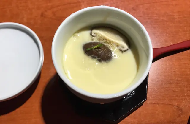 主角不久也奉上來了,同樣豐盛得讓人興奮!先來喝一口湯,清澈見底,可不是普通麵豉湯,是 "肝吸"!那件看上去不太可口的鰻魚肝,香港甚少見卻是爽口帶甘潤的滋味,鮮甜的湯令人喝得清新舒服附上的茶碗蒸,蛋香滑又充滿高湯的甜,碗底有雞肉、白果、椎茸等,碗面嫩綠的葉上,加放了些乾製柚子皮
