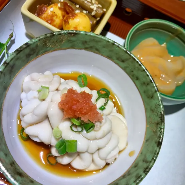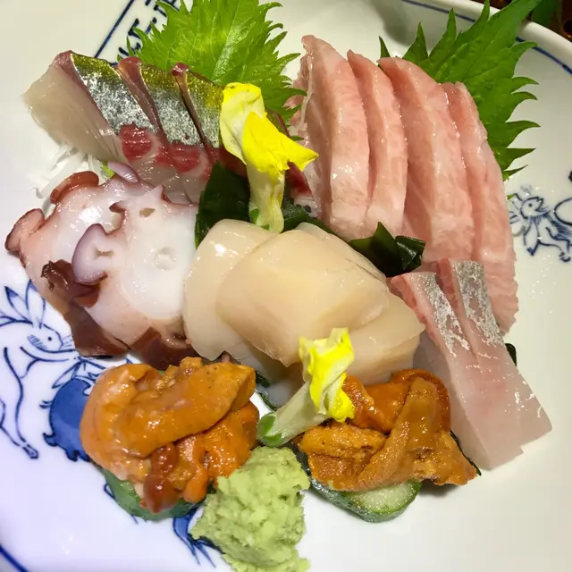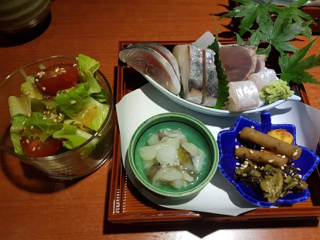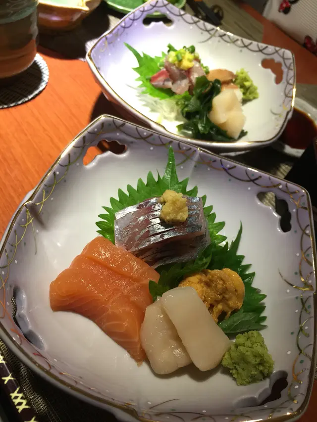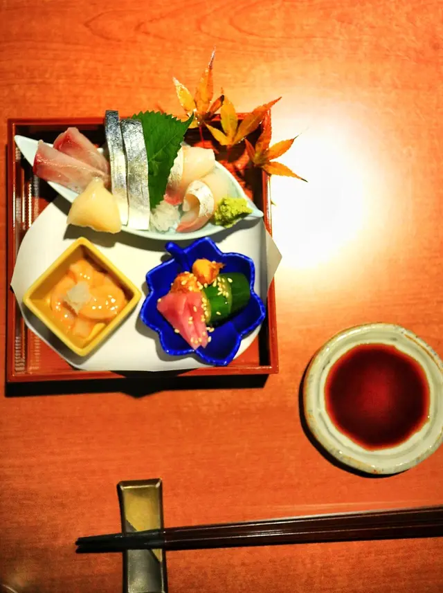 上到店内,是很和式的木製裝潢 ... 是了 ... 那種在日本用餐的肅靜和溫暖!急不及待的點了套餐,很快見到穿上和服的侍者送上餐前沙律 ~ 頗鮮嫩的這店的午餐是以迷你懷石形式奉客,所以先有這盤美食,很精緻吧!雜錦刺身中的鱆紅、帆立貝、鰺魚等都頗新鮮,還有酒盗和漬物,前菜真的有夠豐富啊