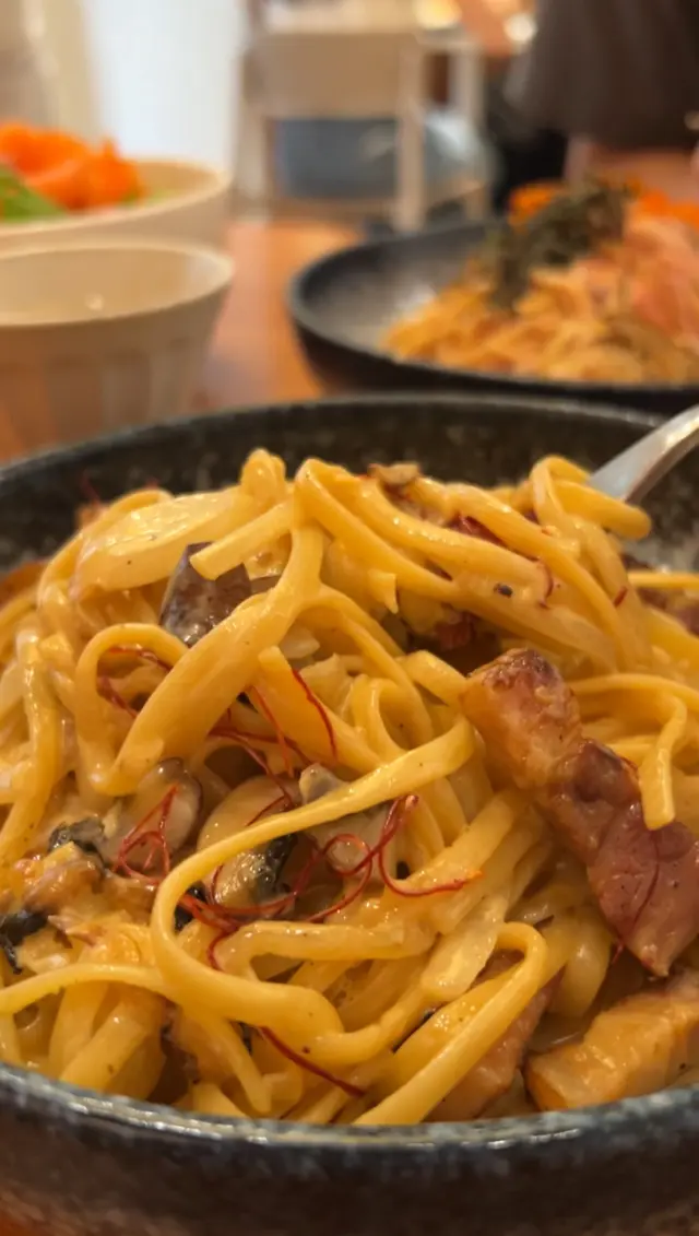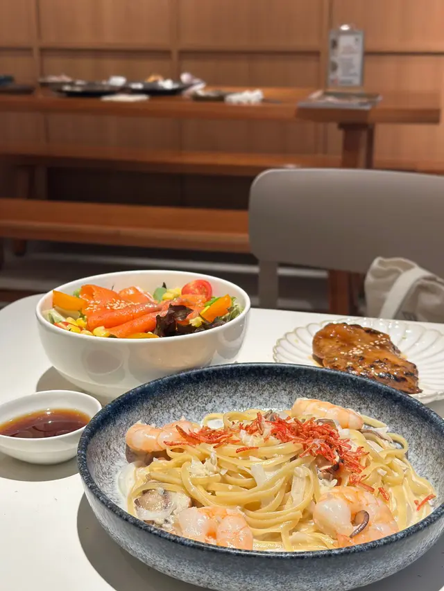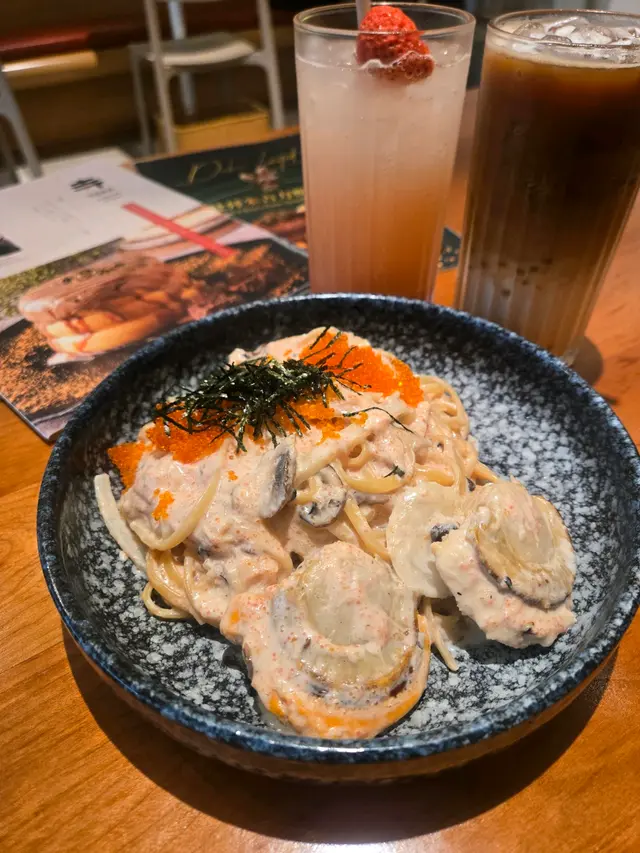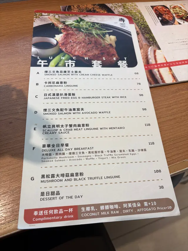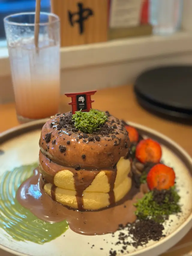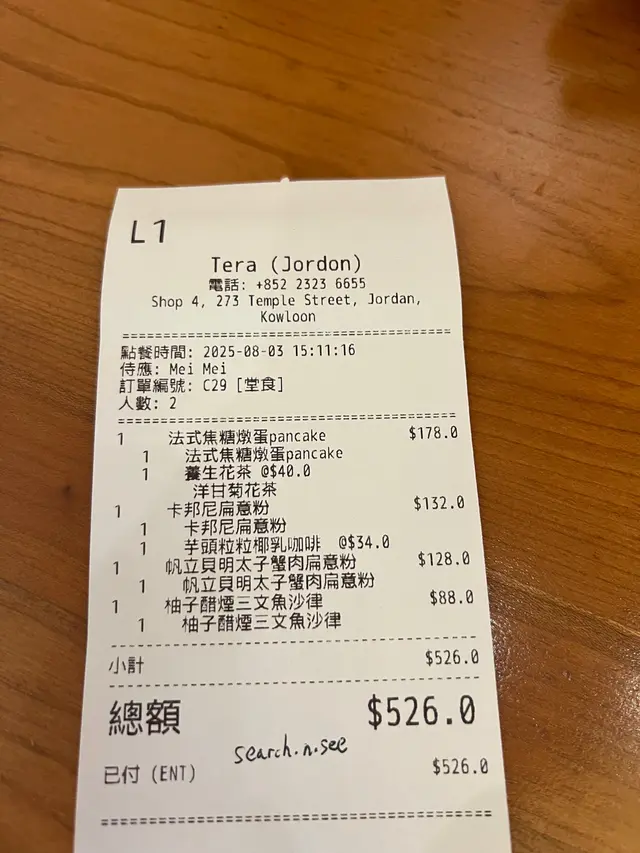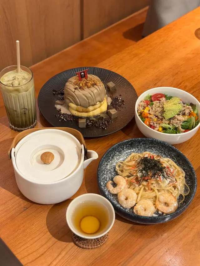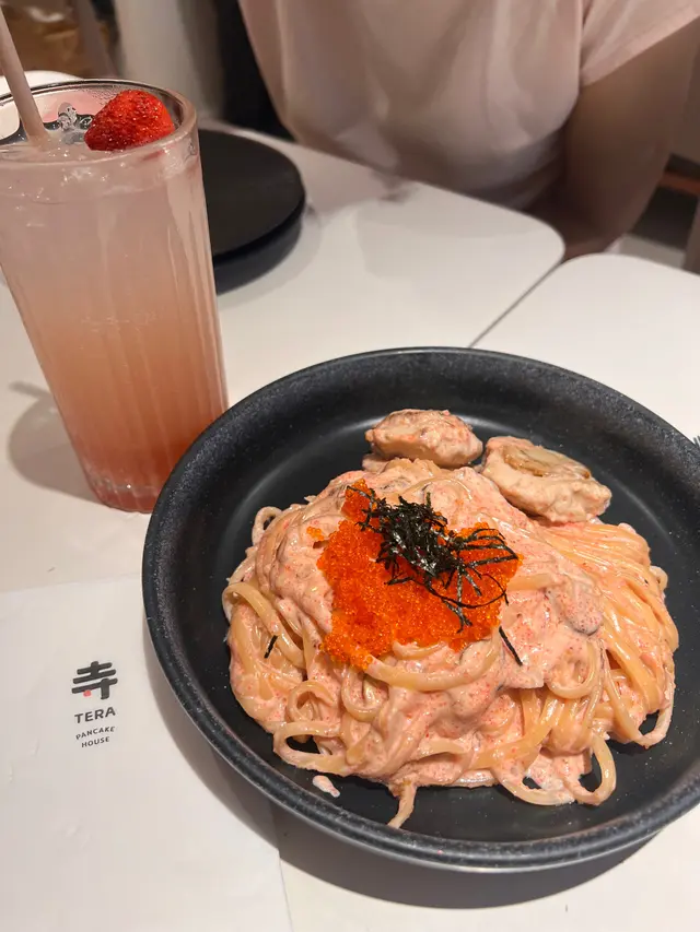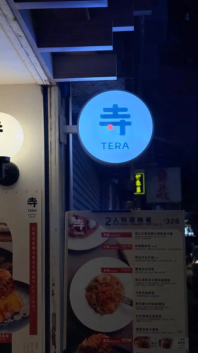 「Tera」純白外表看起來相當日式,內裏裝修風格走日式簡潔寺廟設計,懸掛一個大大的燈籠🏮。柚子醋蟹肉牛油果沙律 $98前菜先叫咗一份柚子醋蟹肉牛油果沙律,柚子醋另上,沙律表面鋪上一層蟹肉絲及牛油片,底下就係沙律菜、車厘茄、粟米粒,蟹肉絲味道鮮甜,加入柚子醋汁嘅沙律菜入口清爽,令人胃口大開櫻花蝦大蝦扁意粉 $118叫咗一碟櫻花蝦大蝦扁意粉,大蝦一共有四隻,整齊排列喺碟邊伴碟,意粉除咗加入櫻花蝦乾,仲有海苔絲、蘑菇片、洋蔥等材料,用上扁意粉,忌廉醬汁濃稠,包裹喺意粉上,食落相對乾身啲榛子焙茶梳乎厘班戟 $138最後甜品揀咗一個梳乎厘pancake,梳乎厘一共有三份,口感鬆軟,材料有焙茶忌廉、焙茶牛奶布丁、榛子脆脆、榛子醬、金寶,焙茶牛奶布丁用上北海道3.6牛奶製成,口感滑溜,帶淡淡焙茶香氣,加埋榛子脆脆、榛子醬一齊食香甜有口感焙茶生椰乳 $58天氣炎熱揀咗杯凍飲,焙茶生椰乳入面焙茶苦澀味唔算明顯,加上生椰乳嘅奶香,相對易入口桂花國寶茶 $52想飲得健康啲,就揀選咗喺養生花茶入面嘅桂花國寶茶,桂花茶香氣撲鼻,入口有明顯桂花香,清新解膩…查看更多