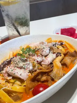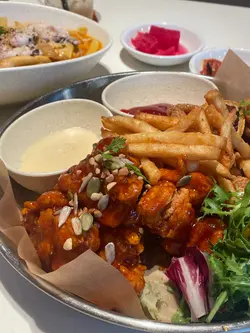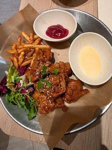 呢晚嚟咗呢间喺商场里边嘅新派韩国菜🇰🇷餐厅食晚餐,我哋坐低嘅时候大约有一半客人,走嘅时候坐满兼要喺门口排队等,喺而家咁嘅时势真系劲揪🤣估计呢间餐厅伙食好好因为见到大部份员工工作勤快兼好有福气🤣$96「玫瑰酱八爪鱼猪五花意粉」:玫瑰酱汁唔肯定里边有乜好似落咗啲 sun-dried tomatoes 去煮充满 umami 出奇地好味🤣,意大利面用咗 Tagliatelle 阔条面煮到少少 al dente 硬硬哋啱胃口🤣,八爪鱼🐙就几爽滑🤣$238「拉出一丝丝芝士排骨锅」:排骨肉质几软熟,配埋拉丝芝士,几好玩又几好食🤣,店员妹妹仲帮我哋拉丝🤣,仲有紫菜饭团可以食,都系可以捞埋拉丝芝士一齐食🤣$258「半半炸鸡」:拣咗有骨嘅炸鸡,口味就拣咗「吃一口就想原谅世界的粟米炸鸡」同埋「带点正宗水原式牛肋骨酱炸鸡」,名字有啲啲鬼马,几好玩🤣;「吃一口就想原谅世界的粟米炸鸡」炸得外边干身几香口🤣,「带点正宗水原式牛肋骨酱炸鸡」甜甜哋咸咸哋湿湿哋味道几得意🤣$42「初夏青柑柚子梳打」同埋 $48「济州柑橘乳酸梳打」:大大杯,都几甜,越饮越开心🤩$132「比初恋还要甜的蜜瓜窝夫」:绿色嘅蜜瓜用匙羹𢳂成一小粒一小粒咁样,细细粒,容易入口,味道非常清甜,好好食🤣;窝夫暖暖哋脆脆哋,配埋鲜忌廉同埋蜜瓜酱,都几甜,几好食🤣劲饱嘅一餐,我哋食完几乎饱到唔识郁🤣…查看更多