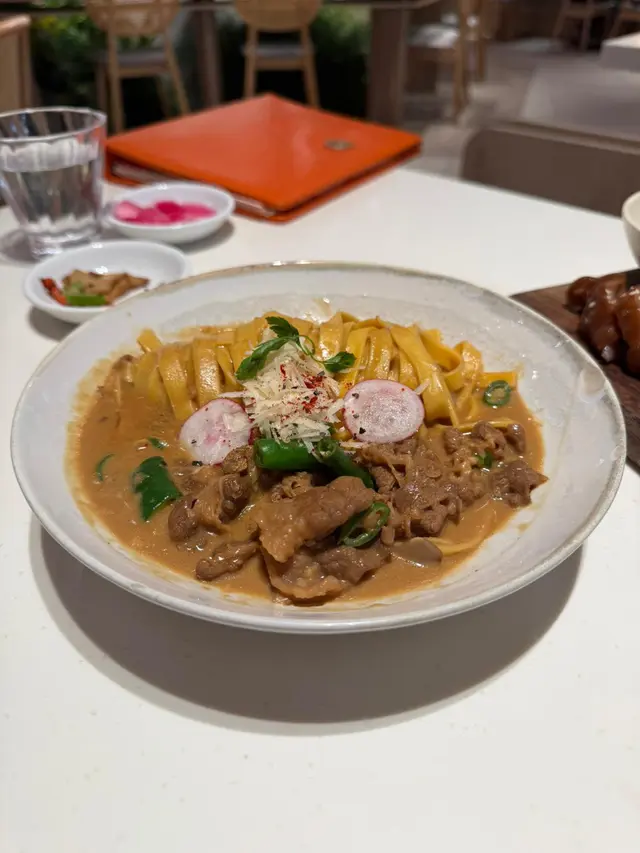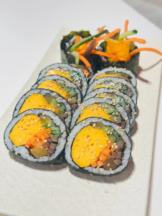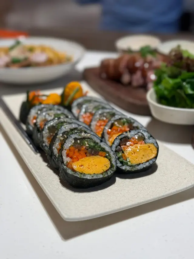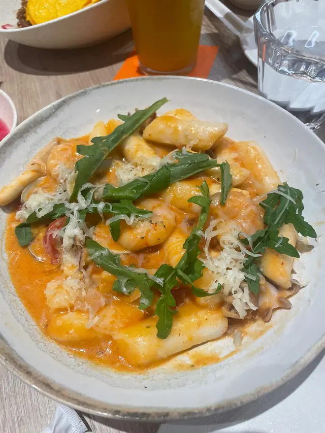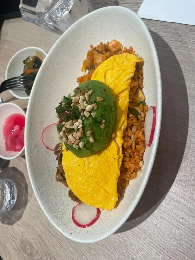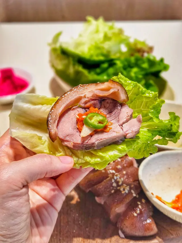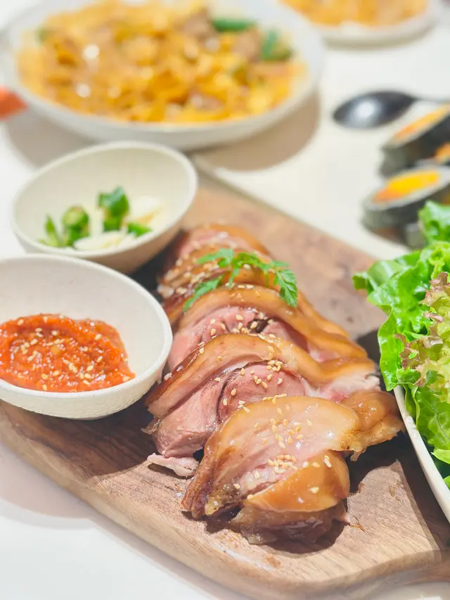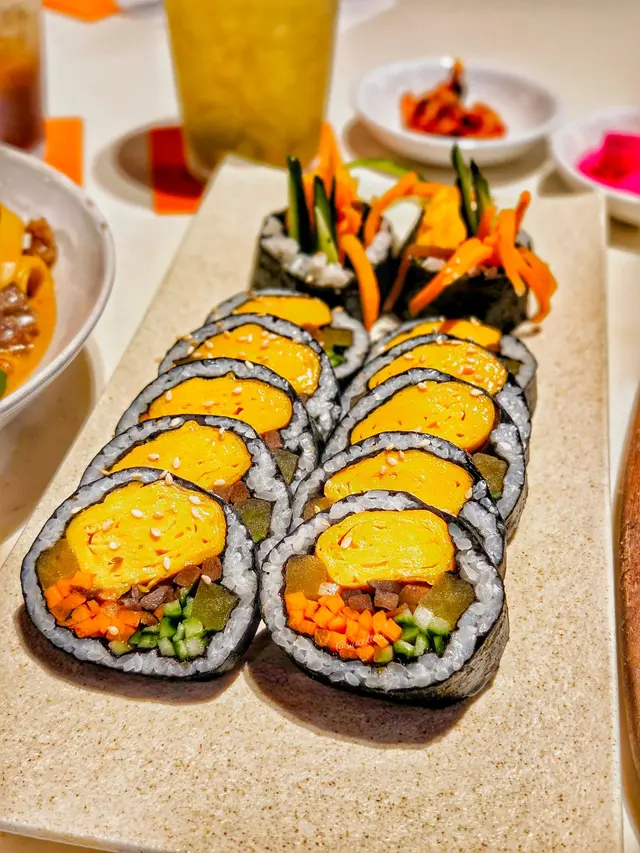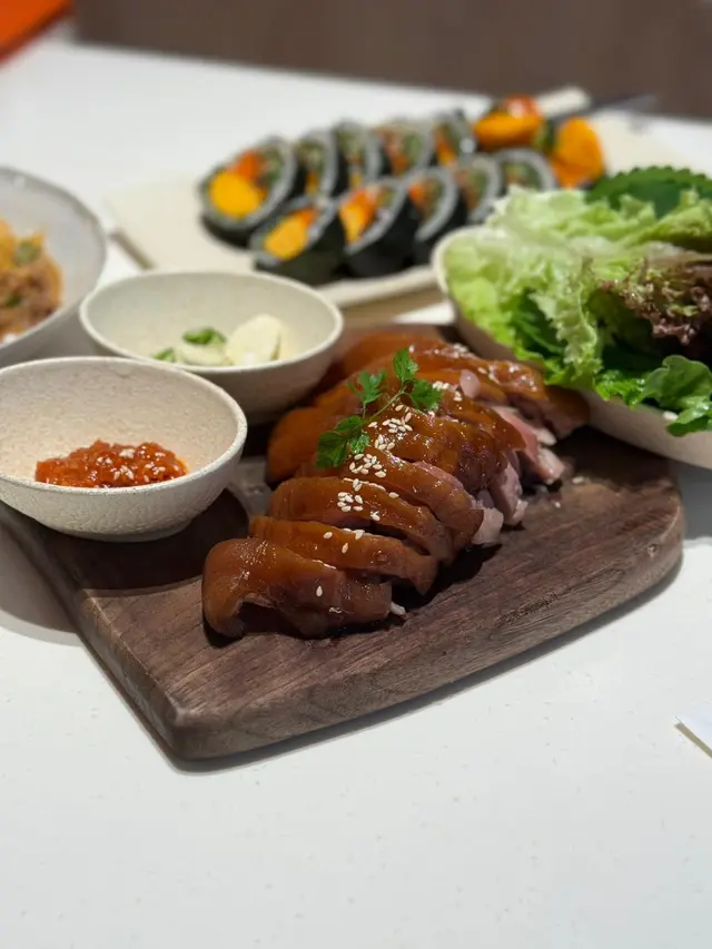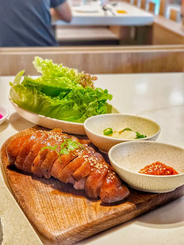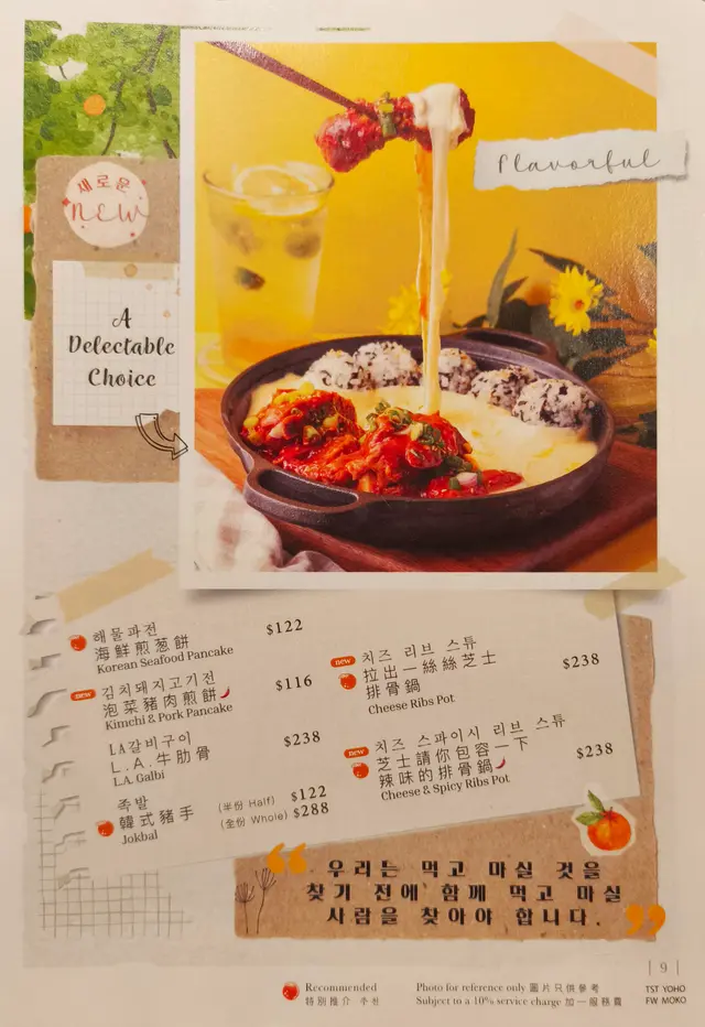 呢間韓食餐廳係商場food court位置,以橙色及木作為裝飾主題,侍應頭上帶住嘅柑橘帽好得意。有個2人餐,由沙律,主食到甜品都包埋,可以試到唔少野。前菜先有煙肉薯仔溏心蛋沙律,簡單材料但口感唔錯,唯唔係溏心蛋,偏向烚蛋。好耐無食過韓式豬手,有少少掛住,仲要唔駛另加錢。以木盤上菜,仲有生菜,韓式辣醬,青辣椒及蒜片包住食。豬手口感彈牙,包埋生菜一齊食,韓式辣醬嘅惹味都好夾豬手,亦可中和佢嘅膩感。澱粉質類要選兩款,其中之一係韓式燉牛肋骨配飯。牛肋骨與白飯份量係相同,上面再有D蛋絲,仲有紅白蘿蔔。醬汁味道係認識嘅韓式燉牛肋骨,配飯係好岩數; 肉質夠腍同入味。另一澱粉質擔當,玫瑰醬海鮮年糕,玫瑰醬係牛奶、茄汁、韓式辣醬三合一,變成淡紅色好似玫瑰色咁,味道香滑得黎有少少辛辣,掛汁程度可以令每條口感煙韌嘅年糕披上一身淡紅色上衫咁。而海鮮類就有蝦,青口及小章魚,整體味道覺得唔錯。包餐飲,都加$28轉飲濟州柑橘乳酪,呢杯絶對係呢度嘅招牌特飲,差唔多枱枱都有杯。外型吸睛,原個柑橘放係杯頂,乳酸味令人開胃,飲完仲可以食埋個柑橘,性價比高。呢客柑橘窩夫伴雪糕唔駛再另加錢,外型又係吸睛嘅。有4件窩夫,每塊都搽上忌廉,再倒少少柑橘醬汁,鬆脆又香甜口感,另有雲呢拿雪糕,橙白色配色令人感覺開心呢個二人餐份量相當對眼,3個人都絶對夠食,全部都係飽肚類,擺盤吸引,食物味道岩胃口,回頭率偏高。…查看更多