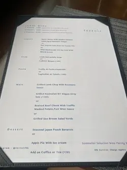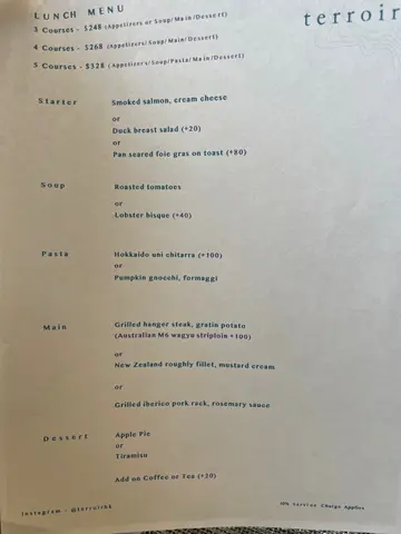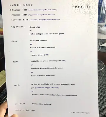 Have been maintaining a list of BYOB restuarants offering free corkage in Hong Kong and Terroir has always been on the top of the list. Finally got a chance to visit Terroir for lunch on a Friday with colleagues, we all think it’s a cozy spot to dine at but the food and services are kinda average. Lunch menu priced at around HK$268 to 368 for 3 to 5 courses. Starter - Water Melon witb Smoked Salmon Salad, Aged Balsamic Vinegar Main - Grilled Lamp Chop with Rosemary Sauce Dessert - Apple Pie with Ice CreamOur Verdict: Whole restaurant only got 2 tables including us throughout the whole lunch session, yet the staff were not attentive and always playing with their phones most of the time. Food quality are really average, basically what you can eat in a cafe, but somehow we have slightly higher expectations before coming here. 💭 The dining experience was fine, but likely won’t come back here again given there’re plenty of better options out there. …查看更多