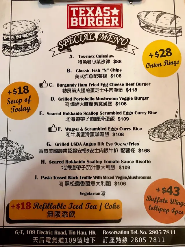 Texas Burger (天后) 网址: https://s.openrice.com/QrLS0Bva200 地址: 香港天后電氣道109號地舖 电话: +852 28057811