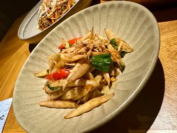 久未曾尝泰北菜肴,一于寻味到此。鱿鱼青芒果沙律堆得很高,貌似壮观,实则份量不多:少的是鱿鱼,多的是芒果。芒果酱加芒果条的味道掩盖一切,泰式紫苏的香气好像消失掉,每口就是芒果味鱿鱼,芒果控友人激赏。仅有三件羊架的烧澳洲羊架青咖哩,每件羊架都包著劲厚的肥脂层,但因为只有三旧,结果迫于无奈之下甚么都要吃下肚!青咖哩味道平和,奇怪的是其下的茄子蓉,有点格格不入的感觉。黑毛猪湿炒河较为好些,起码猪肉爽而对味!无奈又是奇少,只得数片。加入泰式芥兰、蘑菇、珍珠荀及甘荀同炒,对食味帮助不大。看起来更像是茶记的湿炒河,不过价钱当然矜贵得多!对于小人而言,属中级水平。…查看更多