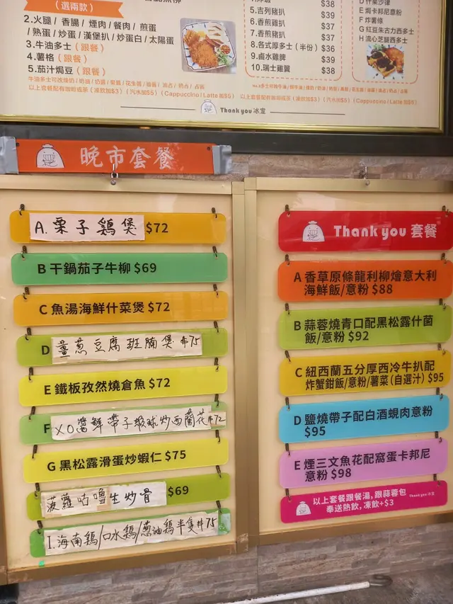 最近朋友recommend 去咗呢Thank you try try.之前都冇嚟過 見佢話好食就嚟試吓嘗鮮嘗鮮。 一入到餐廳 餐廳入面擺設同一般冰室冇乜分別 左右兩排卡位 中間再有幾張枱 都幾多人,我哋都要等一等先至入到去 大概5分鐘左右有人埋單我哋就入去坐低等嘢食 我叫咗個常餐 瑞士雞翼沙嗲牛肉公仔麵跟多士炒蛋 呢啲咁Basic嘅嘢一定好難中伏 上餐都幾快 唔使一陣就已經齊晒 雞翼唔錯 啲滷水好入味 沙嗲牛肉都好正常 有應有水準 係個炒蛋變咗少少蛋餅咁嘅形狀 唔係平時食開滑身嗰啲 整體嚟講都算唔錯 可以再去