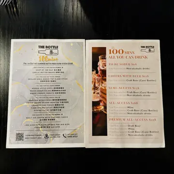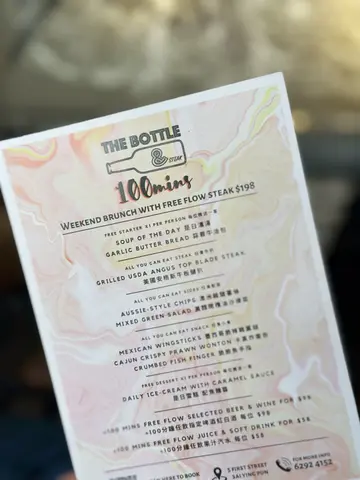 放工去咗位于西营盘嘅《The Bottle & Steak》,一间人气超高澳洲扒房,主打「100分钟 Free Flow Steak」套餐,星期日至四晚市只需$258,CP值几高💫SET DINNER WITH FREE FLOW STEAK $258头盘 (每位赠送一容)🍴忌廉蘑菇汤|蒜蓉牛油包忌廉蘑菇汤香浓滑身,蒜蓉牛油包微脆带香,和忌廉汤系绝配任食牛扒🍴美国安格斯牛板腱扒店员建议五成熟,熟度刚好,表面有清晰烧烤纹路,肉质香浓带嚼劲,烤得够juicy,香气十足任食配菜🍴澳洲鸡盐薯条|黑醋橄榄油沙律菜|焗香草车厘茄澳洲鸡盐薯条 - 厚切炸得够香脆,吃不停口黑醋橄榄油沙律菜 - 爽脆清新,食完好开胃焗香草车厘茄 - 洒满香草,淡淡香草香气,清新解腻任食小食🍴墨西哥脆辣鸡翼锤|卡真炸云吞|脆脆鱼手指|带头吉列虎虾|吉列酥炸生蚝小食种类丰富,全部都外层金黄酥脆,每件都香口惹味当中最喜欢:❣️带头吉列虎虾 - 虾身大大只,炸浆薄脆,咬落去肉质弹牙又鲜甜,每啖都好满足❣️墨西哥脆辣鸡翼锤 - 外皮香辣,鸡肉嫩滑多汁,咬落啖啖微辣香料味,非常惹味甜品🍨是日雪糕配焦糖酱吃过主菜后,每人还有一客雪糕,大满足!🍻🍻饮品🍹🍹另外餐厅亦提供100分钟任饮汽水或酒精类饮品,每位只需加$68 - $198就可尽情享受查看更多