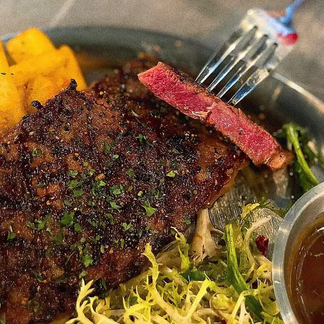 朋友好钟意食牛, 成日都会拉我周围去食牛, 今次就揾到一间超抵嘅牛扒任食, 牛扒任食真系第一次, 仲要只要$298(星期五,六)就可以任食安格斯牛板键扒,除左任食牛扒,连小食及配菜都系任食,超抵食💯, 唔怪得之咁多人! 餐厅装修是美式简约风格,  够feel 够轻松, 而且店员都好主动热情,超nice!💫100分钟任食美国安格斯牛板腱扒💫🌟汤品: 是日浓汤‧忌廉蘑菇汤、蒜蓉包浓浓忌廉蘑菇, 好creamy, 配埋蒜蓉包, 绝配!🌟任食牛扒: 美国安格斯牛板腱扒店员建议5成熟, 厨师前得刚刚好, 牛扒有淡淡炭烧香味, 外层煎得刚好,充份锁住肉汁, 边位带焦脆, 5成熟保留口感之余, 而且肉汁丰盈,肉味浓郁, 配上烧烤汁已经好正! 仲要任食, 我同朋友都忍唔住encore 多一次, 再添依然保持水准!☀️任食配菜: 鸡盐薯条|黑醋橄榄油沙律菜|焗香草车厘茄牛扒当然要配薯条, 厚切薯条即炸即起, 热辣辣劲好味, 外脆内绵密, 洒上鸡更惹味。大大盘车厘茄大加分, 酸酸甜甜又juicy, 清新解腻🌟任食小食:墨西哥脆辣鸡锤|卡真炸云吞|脆脆鱼手指|带头吉列虾|吉列酥炸生蚝估唔到连小食都系任食,而且每款都好好味,食完忍唔住再encore!真系超级抵!原只虎虾大大只, 虾肉爽弹, 香脆非常!卡真云吞, 炸得脆卜卜, 而内馅馅料充足, 我至爱!生蚝炸得刚刚好, 内里保持软嫩多汁, 朋友指定encore🍨是日雪糕 配焦糖酱食完仲有雪糕食, 超满足!🍻饮品: Duvel Tripel/ LoveCraft King餐厅另外亦可加($68-$198)享受100分钟任饮汽水或啤酒或葡萄酒, 我地肚量有限, 所以另外点了啤酒, 由店员介绍, 都非常不错!查看更多