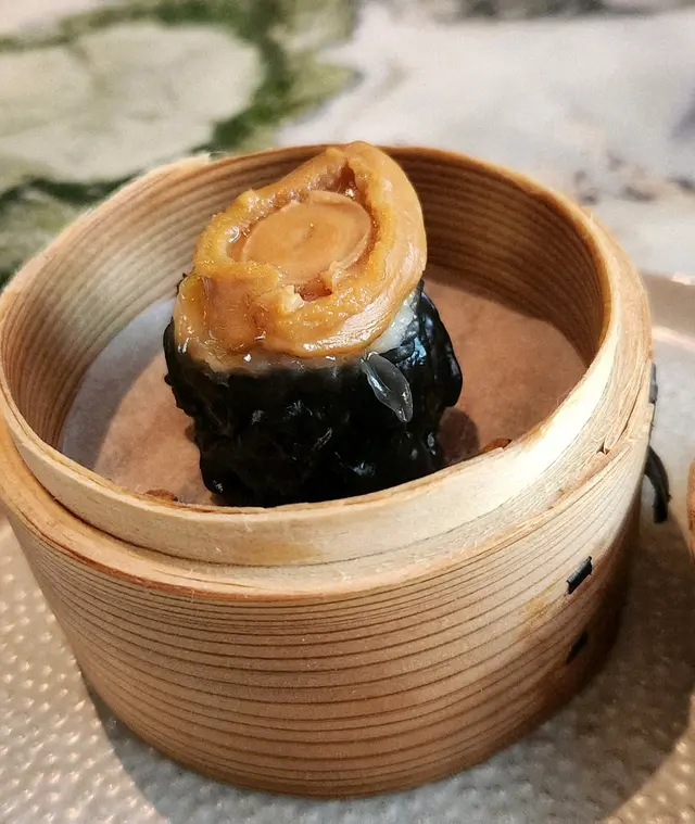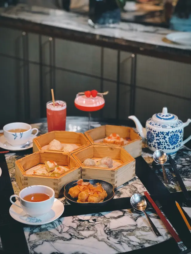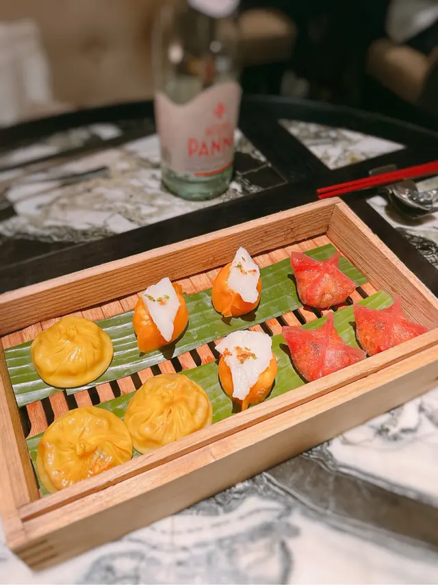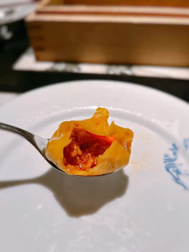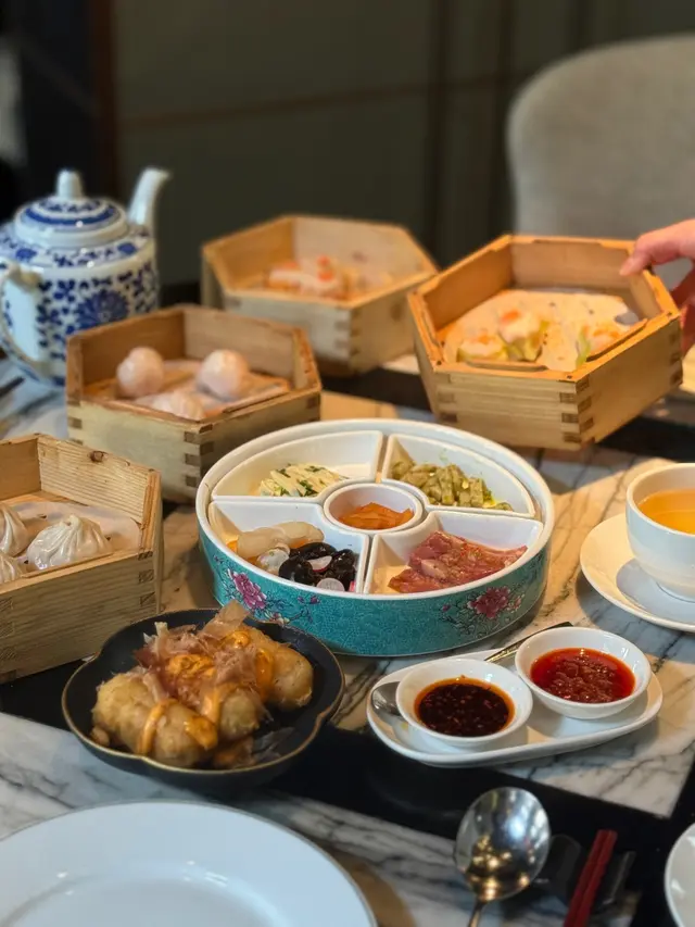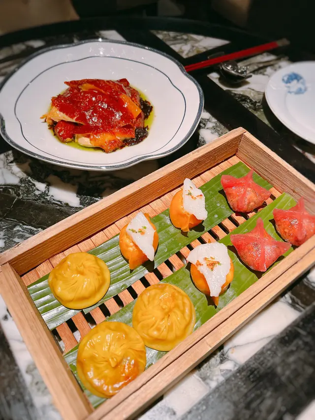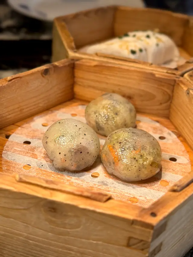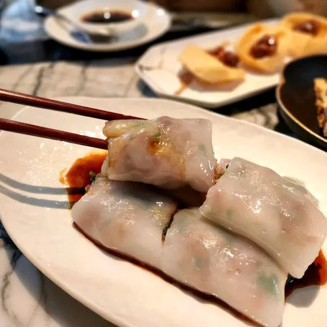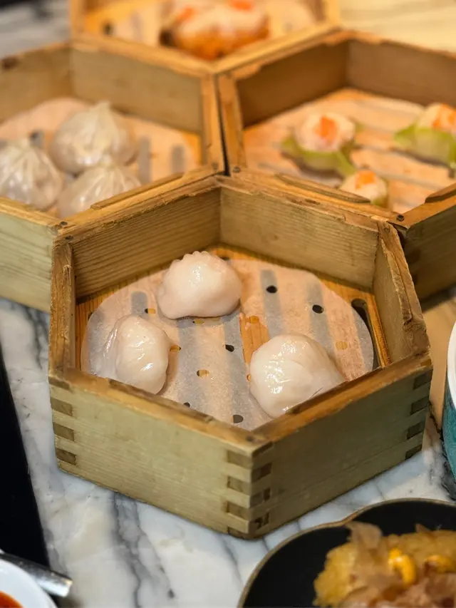黑蒜燒賣原本唔抱任何期待,但係佢係比平時嘅味道增添左一種發酵嘅微微酸,估唔到又幾match,有新意得來又好味。👌🏼口水石斑腸粉只係非常輕微嘅BB辣,腸粉皮整得煙靭有彈性。不過因為石斑魚味道有啲淡,軟腍腍,同腸粉嘅反差口感唔係太大。有新意味道可以,但又未至於好驚喜。:)喇沙小籠包小籠包裡面有啲喇沙味道,帶d 酸酸辣啦但又唔會太霸道,有陣淡淡嘅東南亞嘅口味。味道OK,有新意得嚟又唔會太怪。👌🏼蟹肉海膽春卷海膽味道OK,唔會有浸up味。春卷都外脆內軟,味道唔錯。但係兩件事夾埋,又唔係話好有火花。:)黑松露蝦餃有黑松露嘅味道,味道唔錯。:(和牛酥皮卷好似蘿蔔絲酥卷,但入邊冇和牛嘅感覺。就係一啲醬汁嘅味道再有d 肉粒。普通。:)美祿糯米糍糯米糍外層煙靭,有啲厚度。入邊一啲流心嘅美祿朱古力汁。味道唔錯,頗甜。總結係無論想招呼朋友家人或者商務晏客,既要環境靚又要食物唔錯,呢到都係好選擇。但係如果好執着要傳統酒樓口味就要考慮。…查看更多