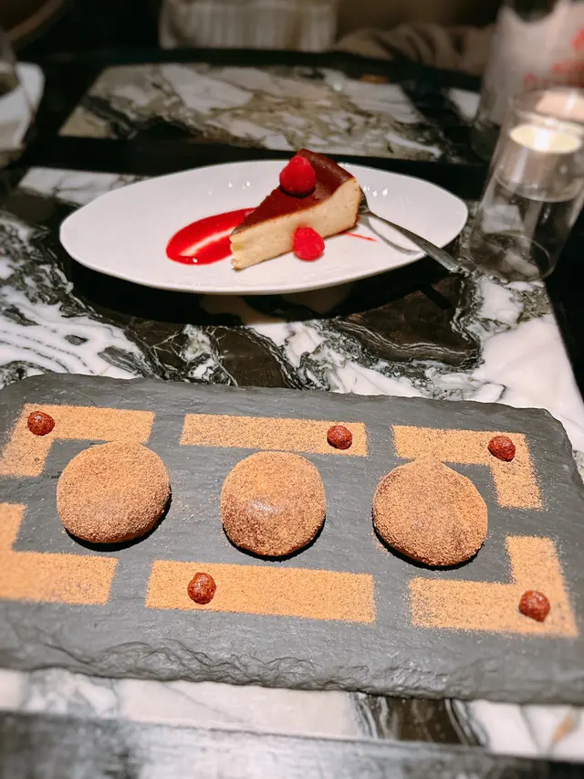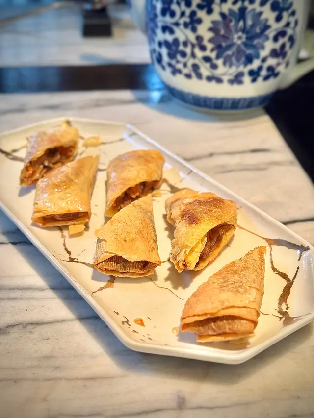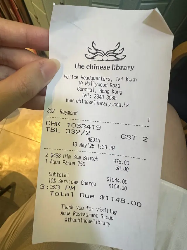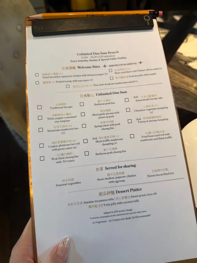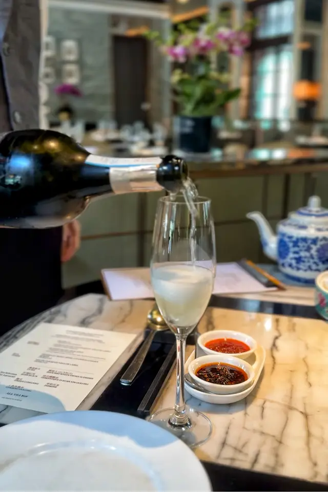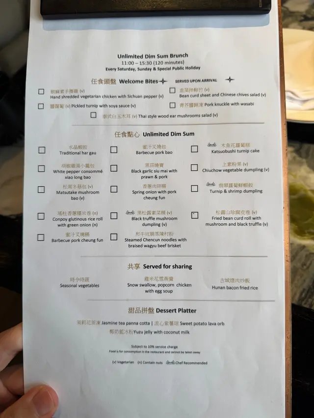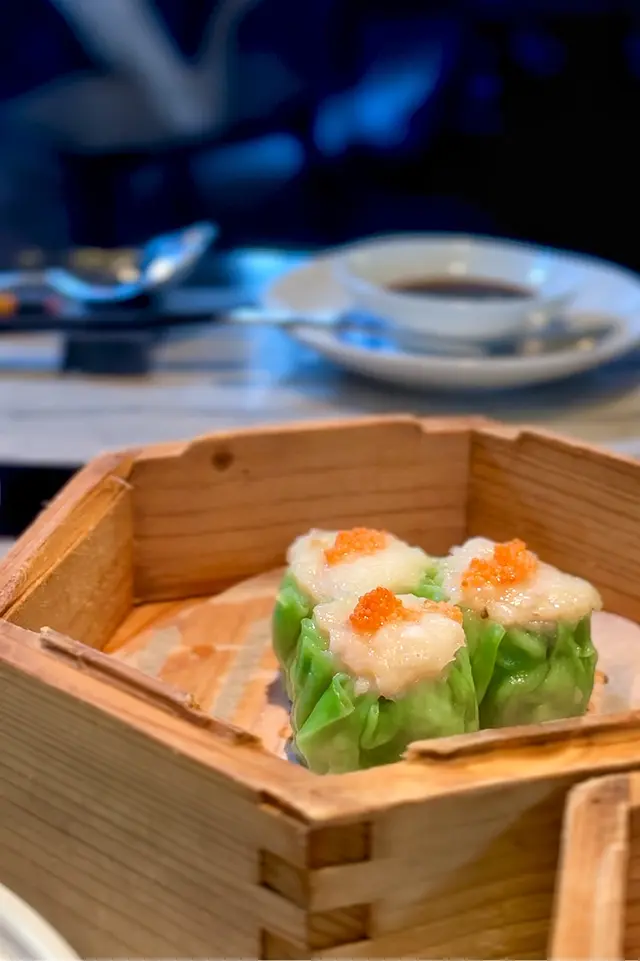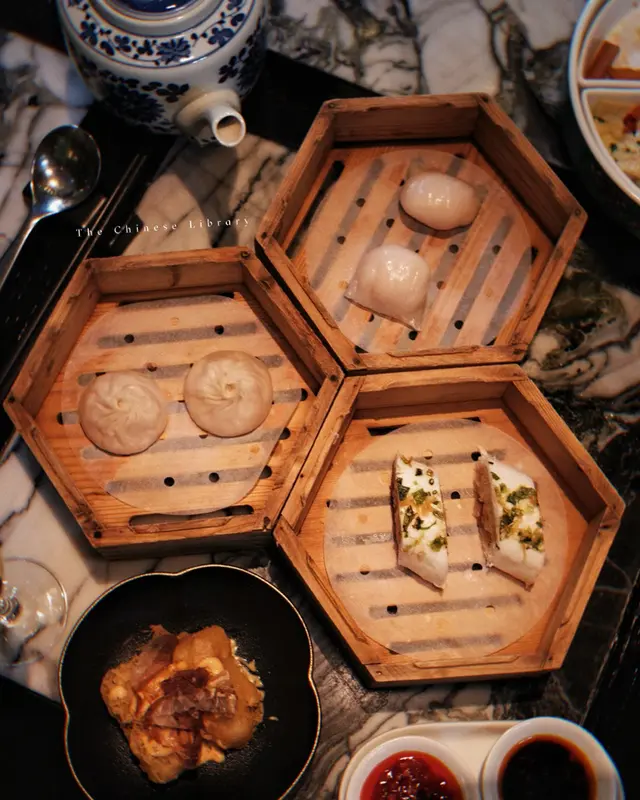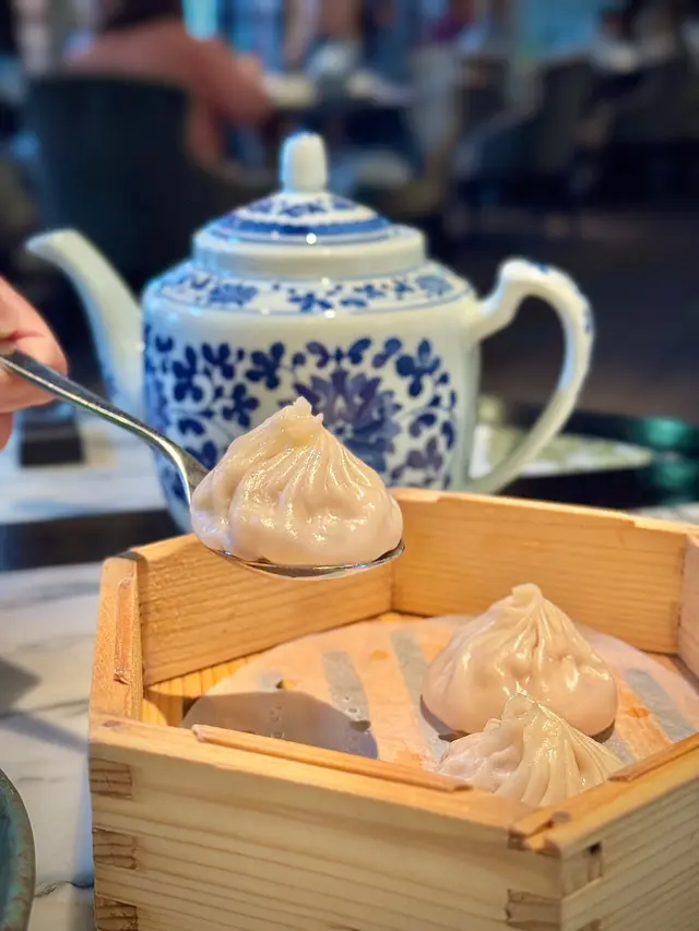 黑蒜燒賣原本唔抱任何期待,但係佢係比平時嘅味道增添左一種發酵嘅微微酸,估唔到又幾match,有新意得來又好味。👌🏼口水石斑腸粉只係非常輕微嘅BB辣,腸粉皮整得煙靭有彈性。不過因為石斑魚味道有啲淡,軟腍腍,同腸粉嘅反差口感唔係太大。有新意味道可以,但又未至於好驚喜。:)喇沙小籠包小籠包裡面有啲喇沙味道,帶d 酸酸辣啦但又唔會太霸道,有陣淡淡嘅東南亞嘅口味。味道OK,有新意得嚟又唔會太怪。👌🏼蟹肉海膽春卷海膽味道OK,唔會有浸up味。春卷都外脆內軟,味道唔錯。但係兩件事夾埋,又唔係話好有火花。:)黑松露蝦餃有黑松露嘅味道,味道唔錯。:(和牛酥皮卷好似蘿蔔絲酥卷,但入邊冇和牛嘅感覺。就係一啲醬汁嘅味道再有d 肉粒。普通。:)美祿糯米糍糯米糍外層煙靭,有啲厚度。入邊一啲流心嘅美祿朱古力汁。味道唔錯,頗甜。總結係無論想招呼朋友家人或者商務晏客,既要環境靚又要食物唔錯,呢到都係好選擇。但係如果好執着要傳統酒樓口味就要考慮。…查看更多